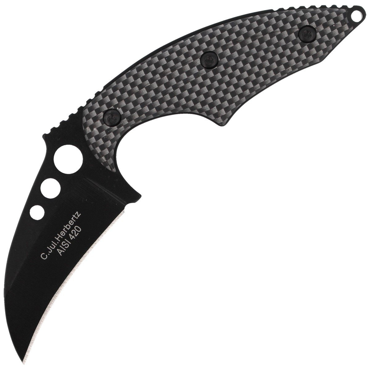 - Nóż typu neck knife niemieckiej marki Herbertz Solingen o konstrukcji full tang z pochwą do zawieszania na szyi. Zaokrąglony kształt ostrza cechuje się ogromną skutecznością. Naśladuje sposób rozszarpywania przez szpon orła lub pazur tygrysa. Bestseller!