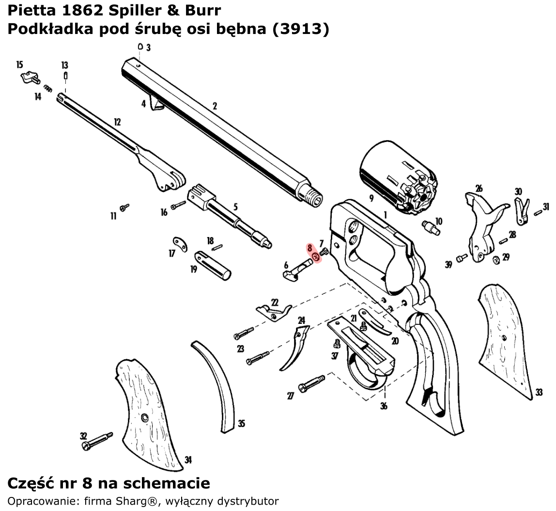 - 3913 (serwis) metalowa podkładka pod śrubę mocującą oś bębna firmy Pietta. Do rewolweru czarnoprochowego 1862 Spiller & Burr .36 cal.