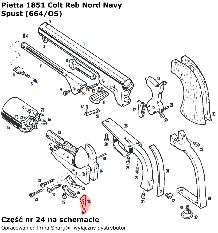 - 664/OS (serwis) spust wykonany ze stali i wykończony metodą OS (Old Silver). Przeznaczony do rewolwerów czarnoprochowych 1851 Colt Navy włoskiej firmy Pietta...