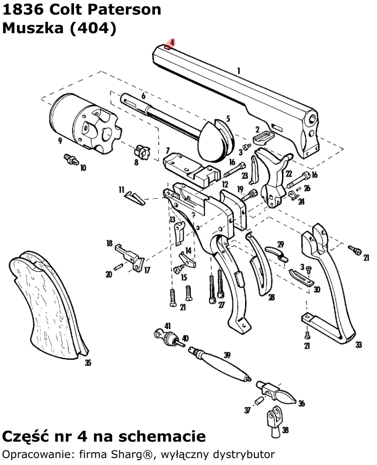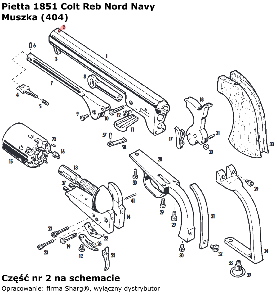 - 404 (serwis) mosiężna muszka włoskiej firmy Pietta. Do rewolwerów czarnoprochowych: 1851 Colt Reb Nord Navy, 1862 Spiller & Burr oraz 1836 Colt Paterson...