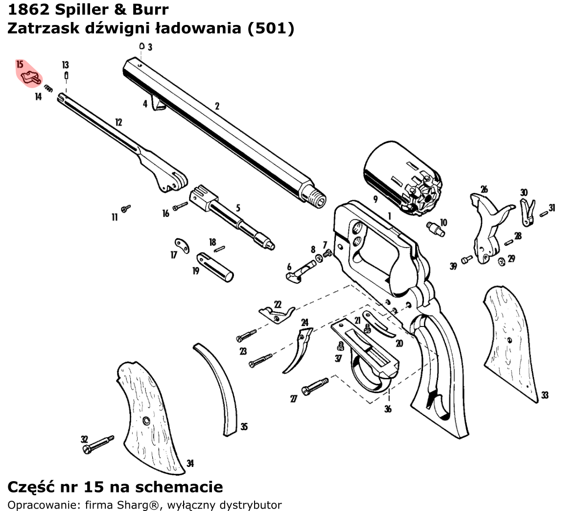 - 501 (serwis) blokada dźwigni ładowania do rewolwerów czarnoprochowych firmy Pietta. 1858 Remington New Model Army .44 cal / Navy .36 cal. Pasuje również do modelu 1862 Spiller & Burr.