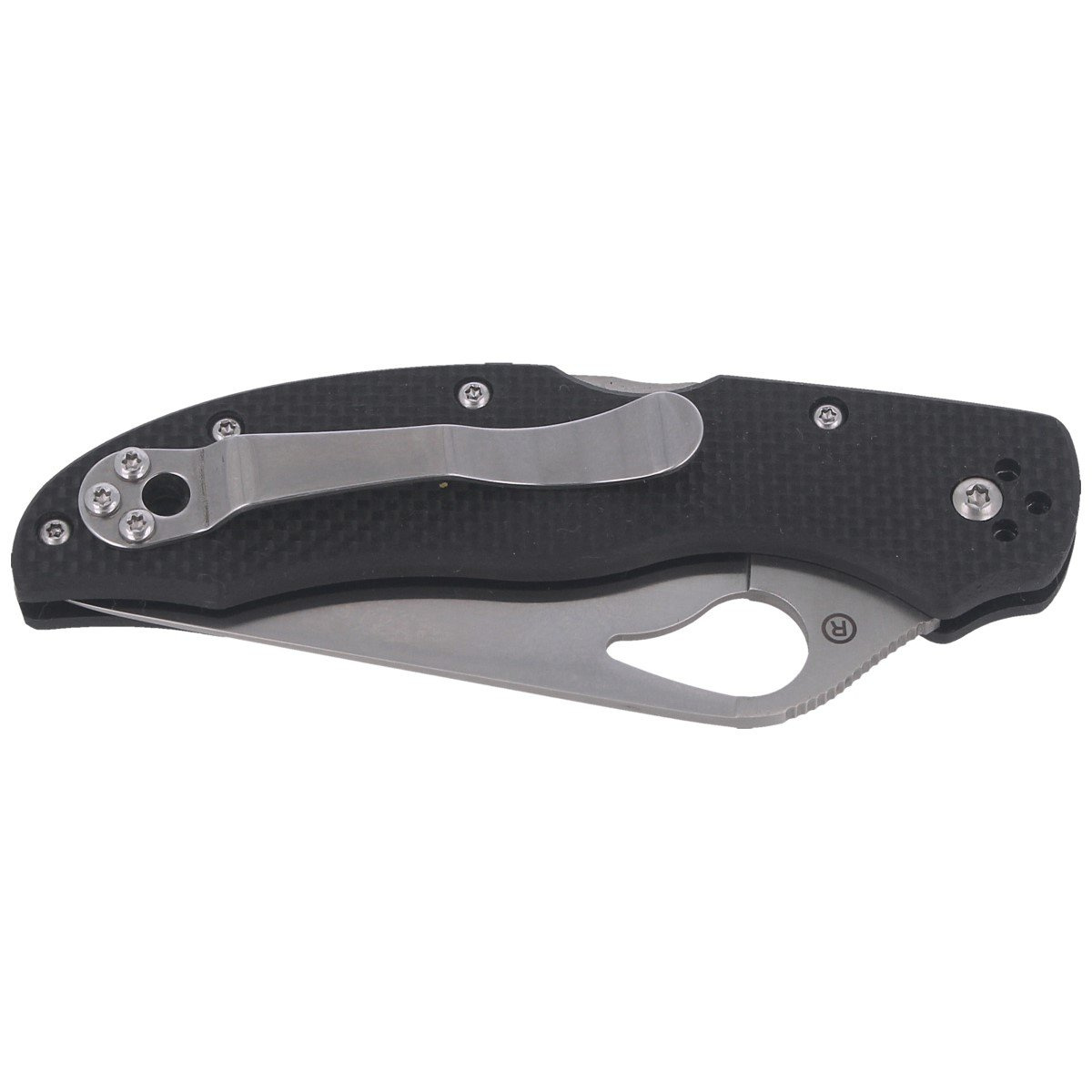 Rękojeść - w czarnym kolorze. Antypoślizgowe teksturowane okładziny wykonane z tworzywa G-10. Klips klepsydrowy z polerowanej stali możliwością mocowania w czterech płaszczyznach (góra/dół, prawo/lewo) 4-way clip positions. W tylnej części rękojeści lanyard hole, otwór na linkę.