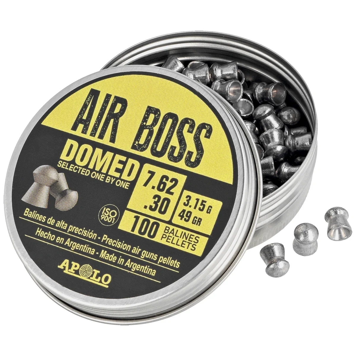 Air Boss Domed .30 ciężki, precyzyjny śrut typu Round (zaokrąglony) o wyśmienitej aerodynamice, retencji i dużej sile uderzenia w kalibrze 7.62 mm. Opracowany przy współpracy z czołowymi producentami mocnych wiatrówek. Współczynnik balistyczny Ballistic Coefficient (BC): 0.043. Indywidualnie selekcjonowana, sztuka po sztuce (Selected One by One) w celu osiągnięcia jak najlepszych rezultatów podczas strzelań na dużych dystansach. Opakowanie 100 sztuk.
