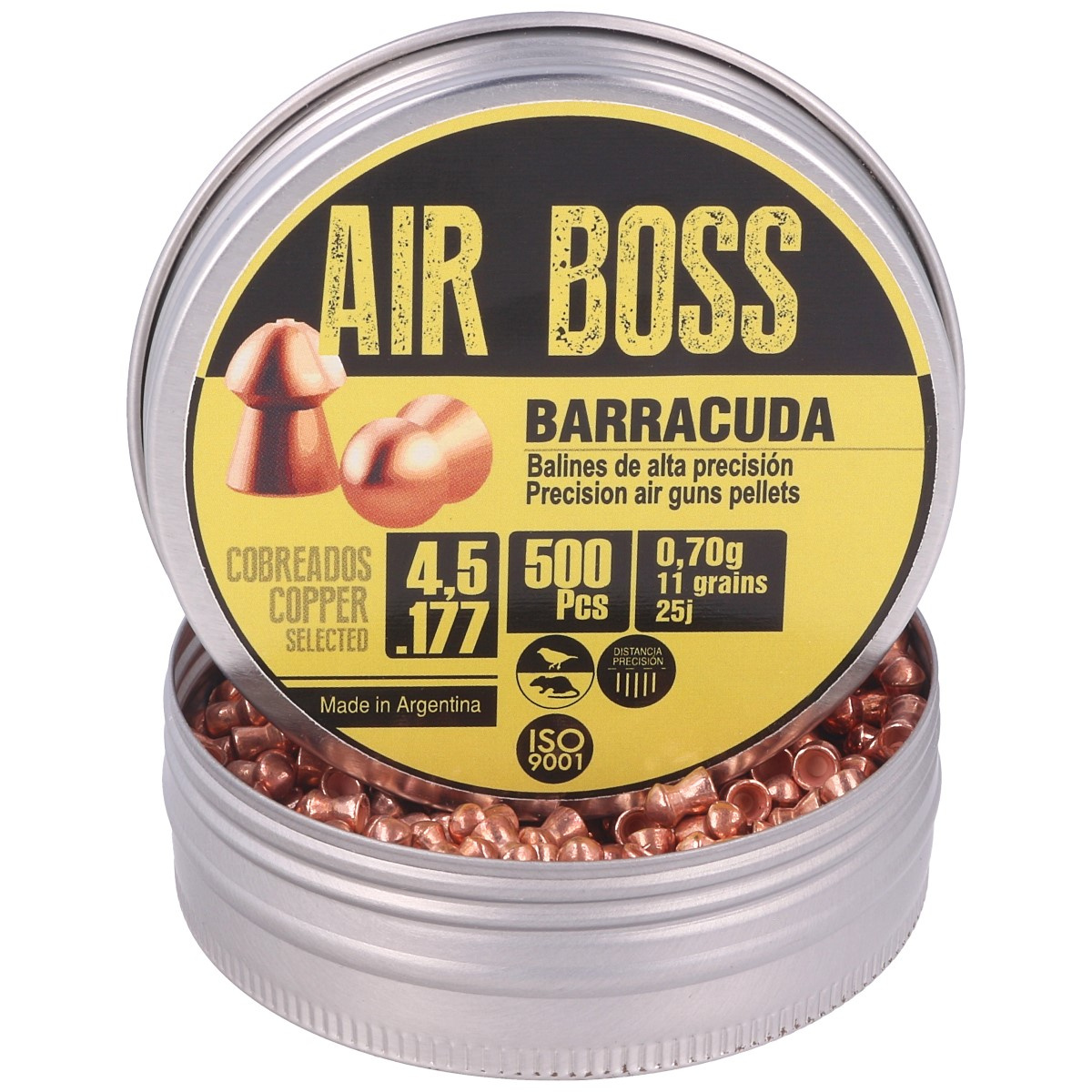 Cechy, które wyróżniają serię śrutów Air Boss Barracuda Copper (High-end line) to wysoka jakość, precyzja wykonania oraz doskonałe wyważenie. Przyczyniają się one do lepszej celności podczas strzelań na duże dystanse. Celność jest wynikiem płaskiego toru lotu i małego opadu na dużych odległościach, które amunicja zawdzięcza redukującej opór powietrza, zaokrąglonej główce (Round). Aerodynamiczny profil zapewnia wysoką siłę uderzenia (współczynnik stopping power) oraz penetrację. Śrucina charakteryzuje się stabilną trajektorią lotu również podczas podmuchów wiatru. Gładki kielich bez moletowania.
