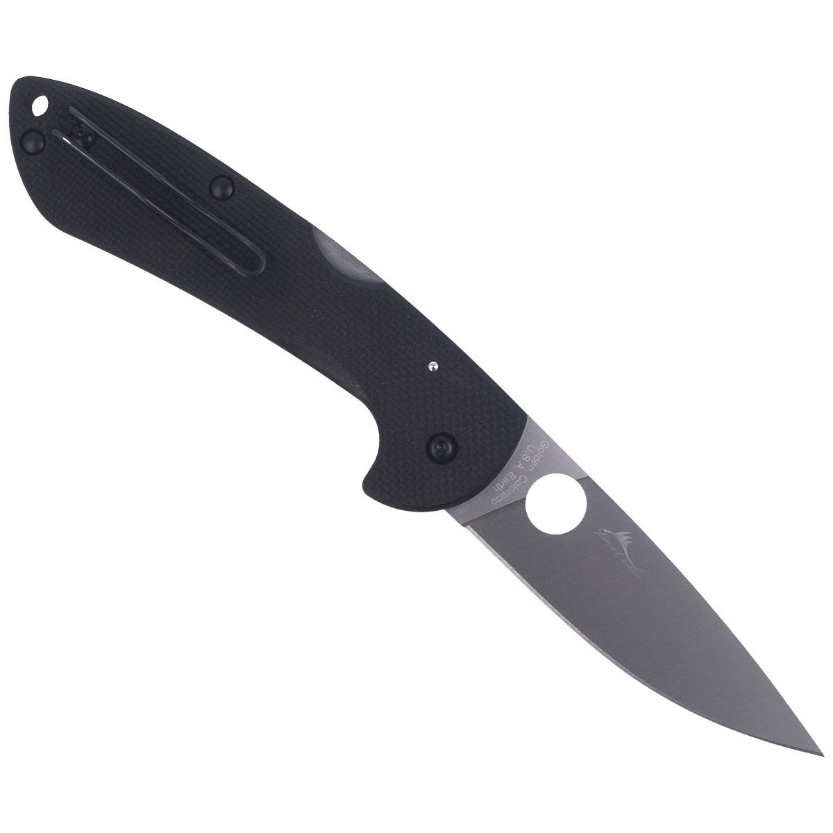 Głownia - smukła i ostra Drop Point z gładkim ostrzem Plain z eleganckim, satynowym wykończeniem klingi. Całkowicie płaski szlif (Full Flat Grind), zapewnia wyjątkową geometrię krawędzi. Powiększone 14 mm wycięcie SpyderHole (patent Spyderco) do oburęcznego otwierania kciukiem. Głęboki index-finger choil, podcięcie pod palec wskazujący dla kontroli uchwytu foldera a także ochrony palca przed zsunięciem się na ostrze.