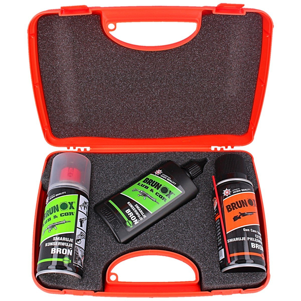 - GUN SET1, zestaw smarów do konserwacji broni: Brunox Gun Care Spray, Brunox Lub & Cor Spray oraz Brunox Lub & Cor w płynie. Całość zapakowano w polimerową walizkę.