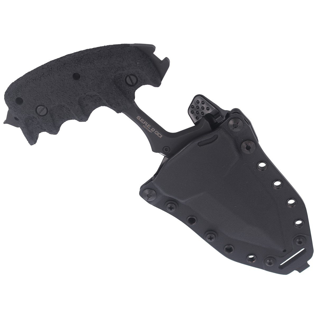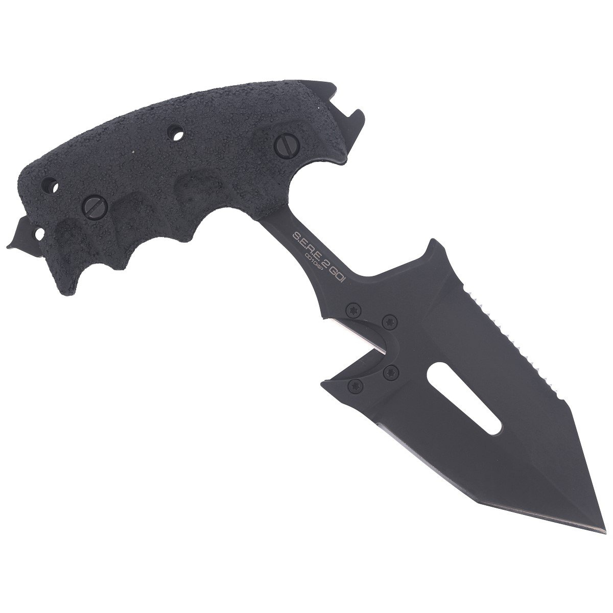 Głownia - geometryczny trójkątny profil dagger, z mocnym czubkiem do przebijania. Pełny płaski szlif to doskonałe cięcie dolnej krawędzi tnącej. Na grzbiecie klingi zostało ząbkowane ostrze do cięcia lin czy drewna. Za głównym ostrzem mamy zagłębienie, w którym zamocowano dwa wymienne ostrza. Dostajemy wtedy dodatkowe narzędzie do cięcia pasów czy fałów. Stal dla dodatkowego zabezpieczenia przed korozją pokryto czarną powłoką MIL-C-13924 na bazie teflonu.