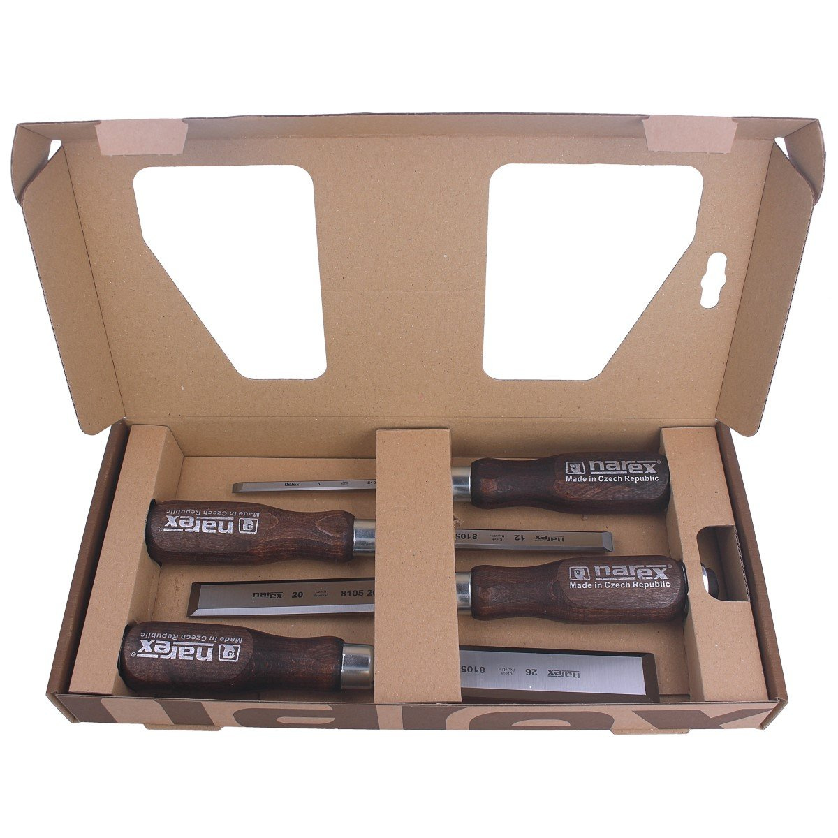 - 863020, 4-ro elementowy zestaw dłut stolarskich płaskich z fazowaniem bocznym z serii Narex Profi. W pełni szlifowane i zaostrzone, innowacyjne dłuta o ulepszonym przekroju ostrza. Ostrza kute z wysokostopowej stali narzędziowej Cr-V
