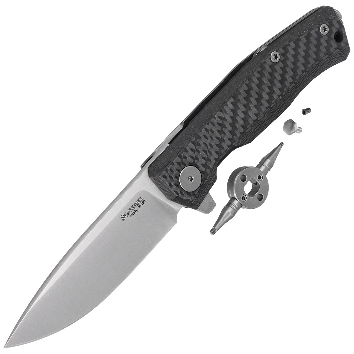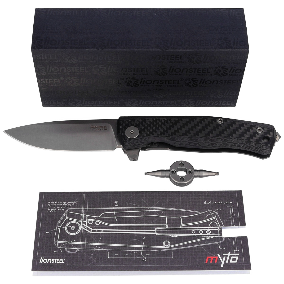 Myto Carbon Fiber, Satin zaawansowany technicznie folder Hi-Tech z wytrzymałą blokadą frame-lock. Wyjątkowy nóż E.D.C. włoskiej manufaktury LionSteel. Wyposażony w ostrze ze stali spiekanej M390, umieszczony na spodzie głowni „ReF”, system łożysk kulkowych Double Crown oraz tytanowy klips. W zestawie LionSteel Hand (#HY 68), klucz do regulacji śrub Torx T6, Torx 8 wraz z sześciokątnym kluczem Hex do śruby zbijaka szyb.