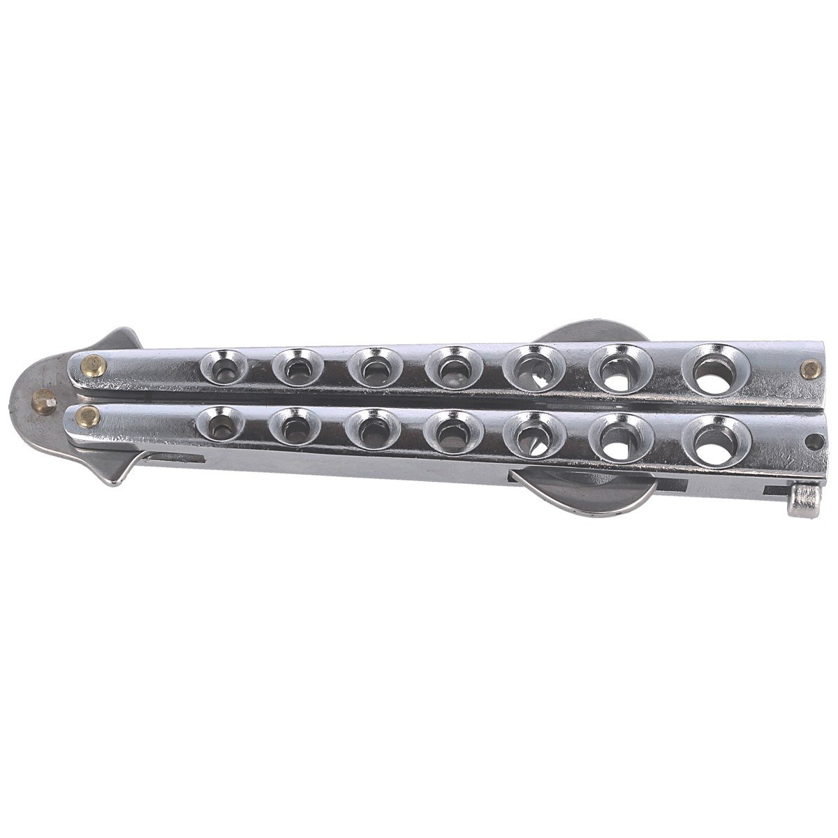 Ramiona - składane jak w oryginalnych nożach balisong / motylkach / butterfly. Oś obrotu ramion zamocowano pivot-pins. Jedno z ramie wyposażono w blokadę notch, która pozwala na zamkniecie ramion rękojeści zarówno w pozycji otwartej jak i zamkniętej.