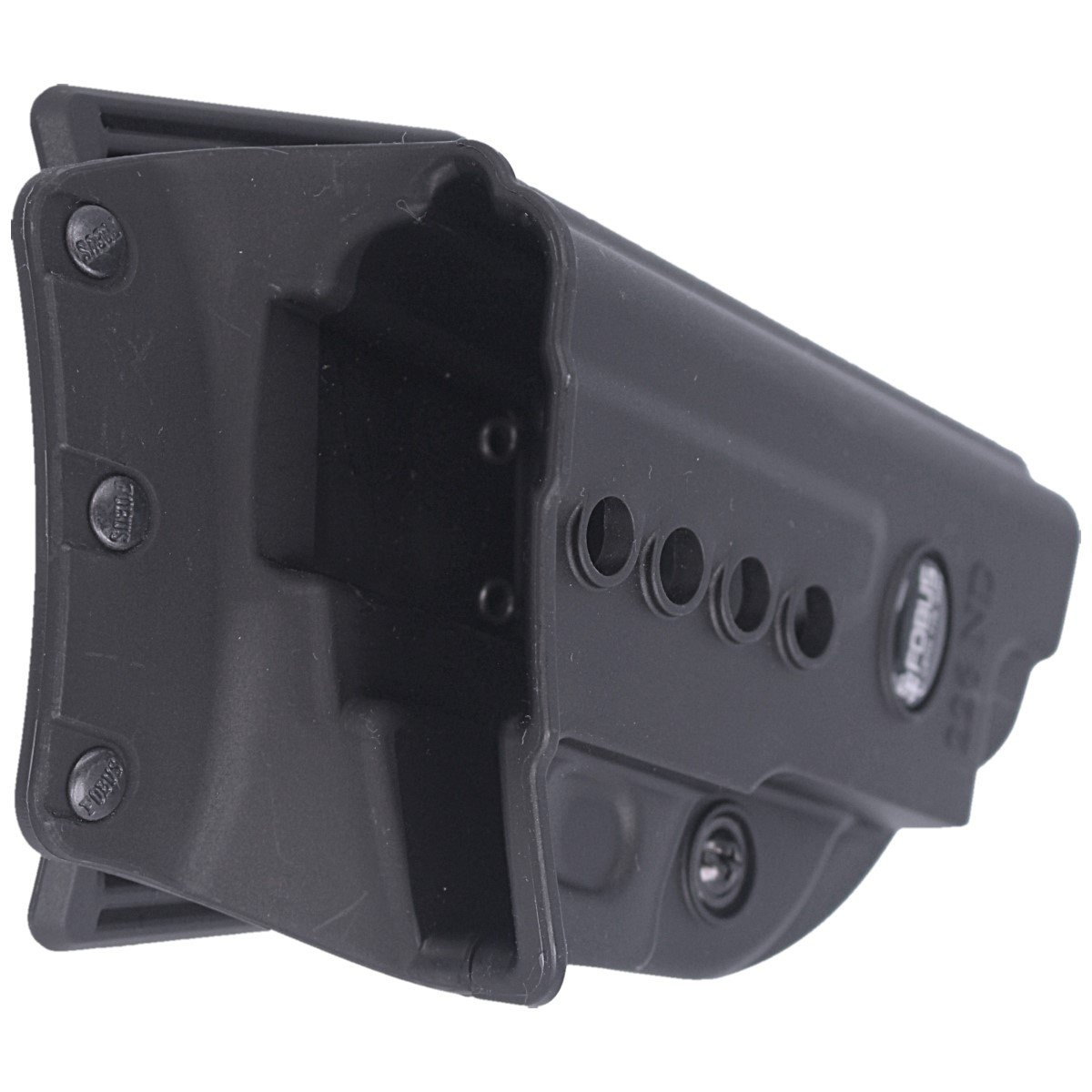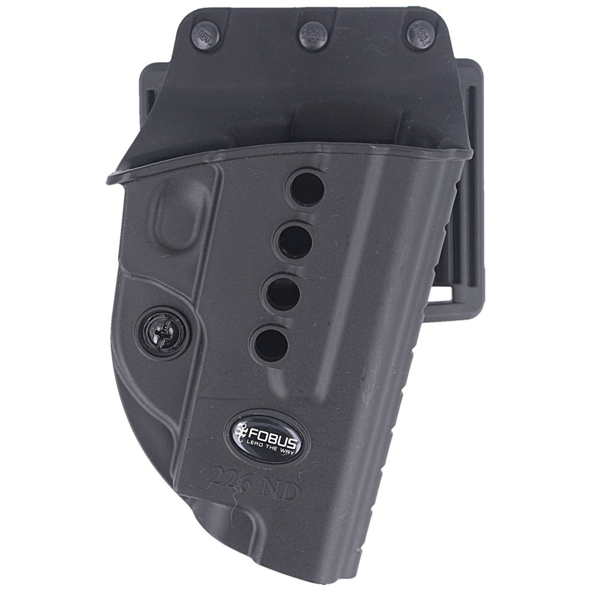Rodzaj kabury - ND / Evolution-2 (New Design / E2 Series) - nowa generacja kabur Fobus. Wykonana z jednego kawałka tworzywa, jest lekka mimo dodatkowych funkcji. Zawiera dodatkowy pasek metalu wzmacniający nity mocujące kaburę z płetwą co poprawia jej wytrzymałość oraz niezawodność. Redukcja wagi została osiągnięta poprzez zastosowanie kilku otworów na powierzchni kabury. Kabury z serii ND / E2 posiadają dodatkową śrubę przy kabłąku umożliwiającą indywidualne dostosowanie siły docisku kabury. Regulacja ma wpływ na siłę z jaką broń jest trzymana w kaburze oraz z jaką siłą jest wyciągana z kabury. Niski profil ułatwia ukrycie broni, zwiększając komfort jej przenoszenia. Kabura dobrze zabezpiecza broń przed uszkodzeniem, nie ma tendencji do przemieszczania się. Dostępna w wersji dla praworęcznych.
