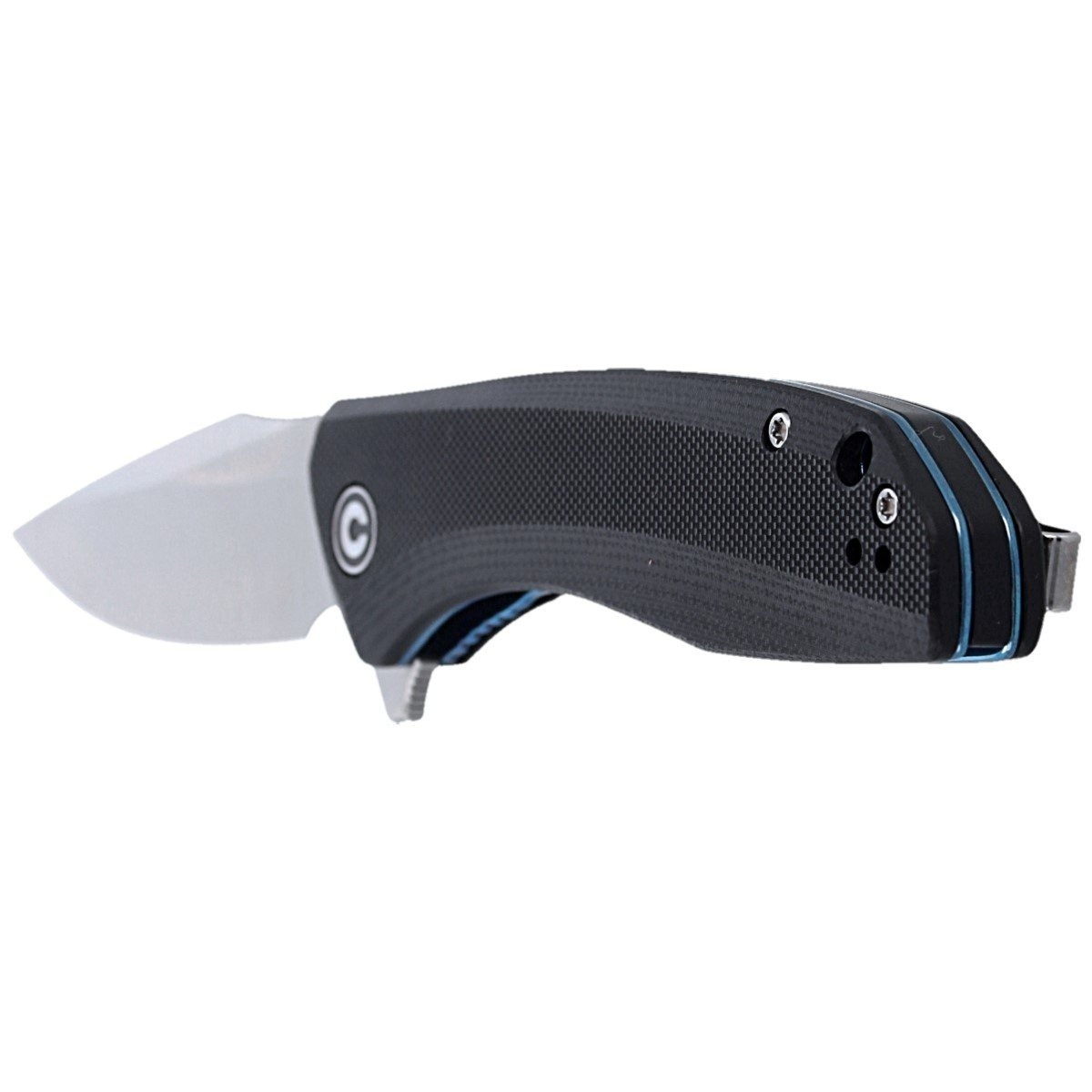 Rękojeść - sfazowane krawędzie dla wygody o antypoślizgowej teksturze dla poprawienia pewności uchwytu, mocowane do linersów ze stali nierdzewnej. Prosta, solidna konstrukcja daje pewność wieloletniego użytkowania bez osłabienia konstrukcji. Backspacer oraz okładziny rękojeści z czarnego tworzywa G10. Oś pivota zdobi stylizowane logo marki Civivi. Dwupozycyjny lewo / prawostronny metalowy klips deep carry pozwala przenosić dyskretnie nóż w kieszeni w pozycji tip-up (czubkiem ostrza do góry). Lanyard hole, otwór na linkę.