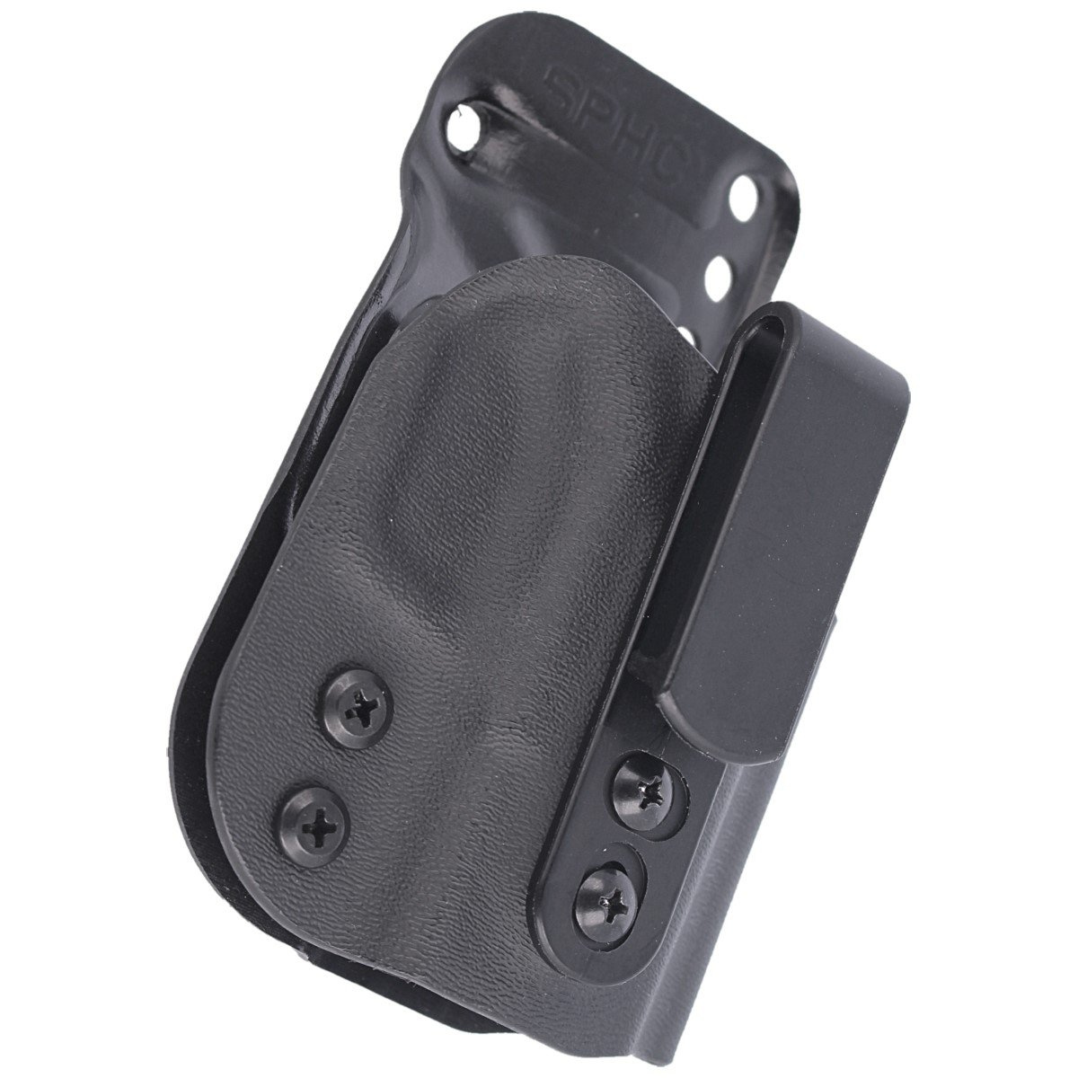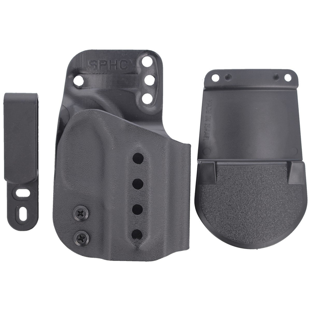 - SPHC kabura zewnętrzna OWB (Outside the Waist Band) i wewnętrzna IWB (Inside the Waist Band) w zależności od potrzeb. Do skrytego noszenia (IWB) mocowana od wewnętrznej strony spodni na pas. Śruba regulująca siłę docisku kabury. Do Springfield Hellcat 9mm