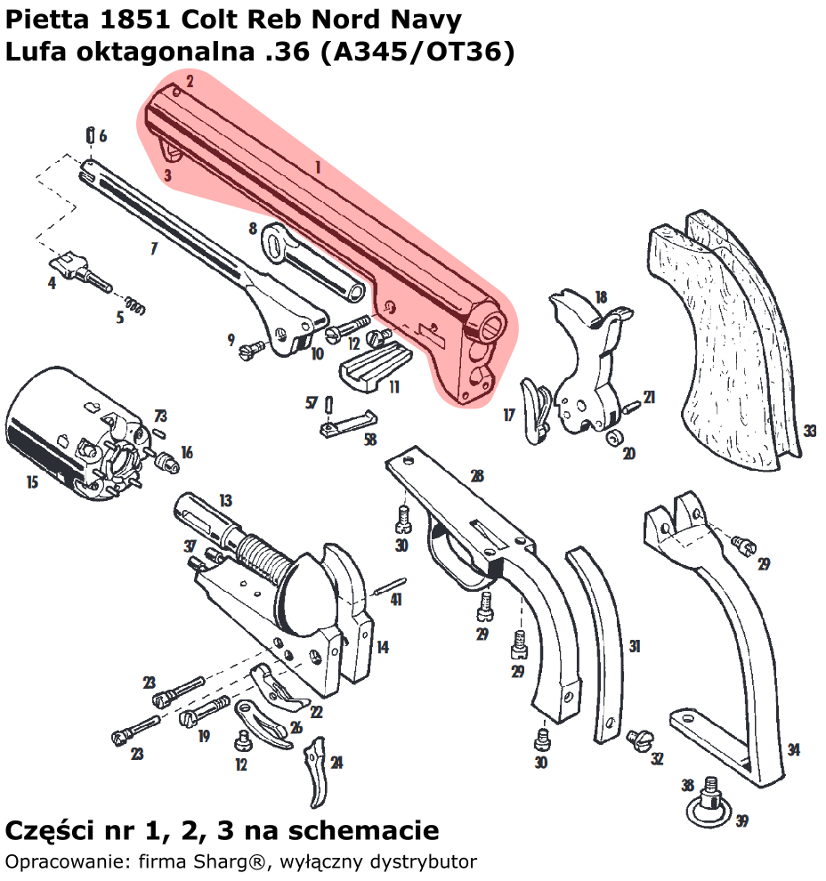 - A345/OT36 (serwis) lufa gwintowana kal. .36 do rewolwerów czarnoprochowych 1851 Colt REB Nord Navy firmy Pietta. Oktagonalna o długości 7.5", oksydowana na czarno. Wyposażona w przyrządy celownicze, front sight (#404) oraz mocowanie dźwigni stempla (#676)