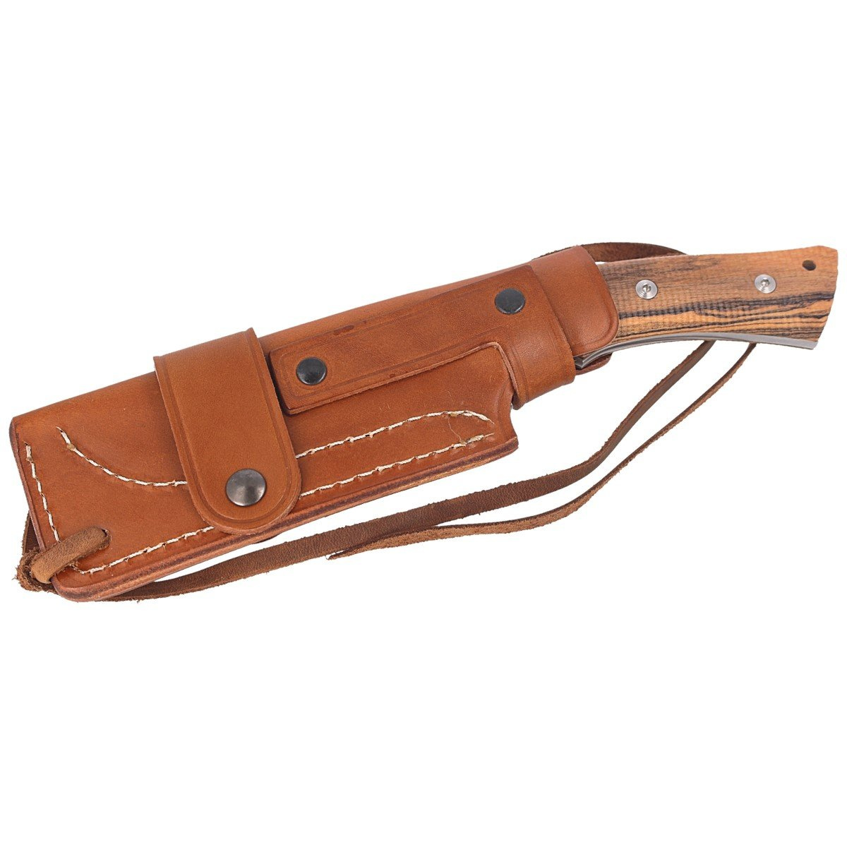 Pochwa - przedłużana, chroniąca głownię wraz z częścią rękojeści. Ręcznie szyta, wykonana z wysokiej jakości naturalnej skóry w kolorze brązowym z tłoczonym logo producenta. Brzeg etui przeszyto ozdobną nicią. Zapinana na zatrzask typu Prym. Mocowanie na pas lub do oporządzenia umożliwia przenoszenie noża w pozycji pionowej lub poziomej.
