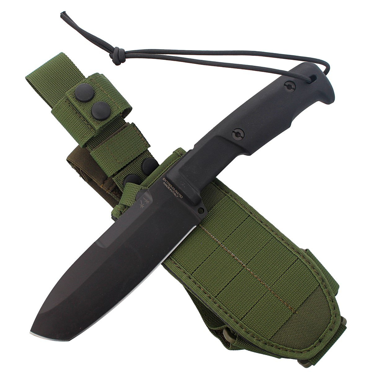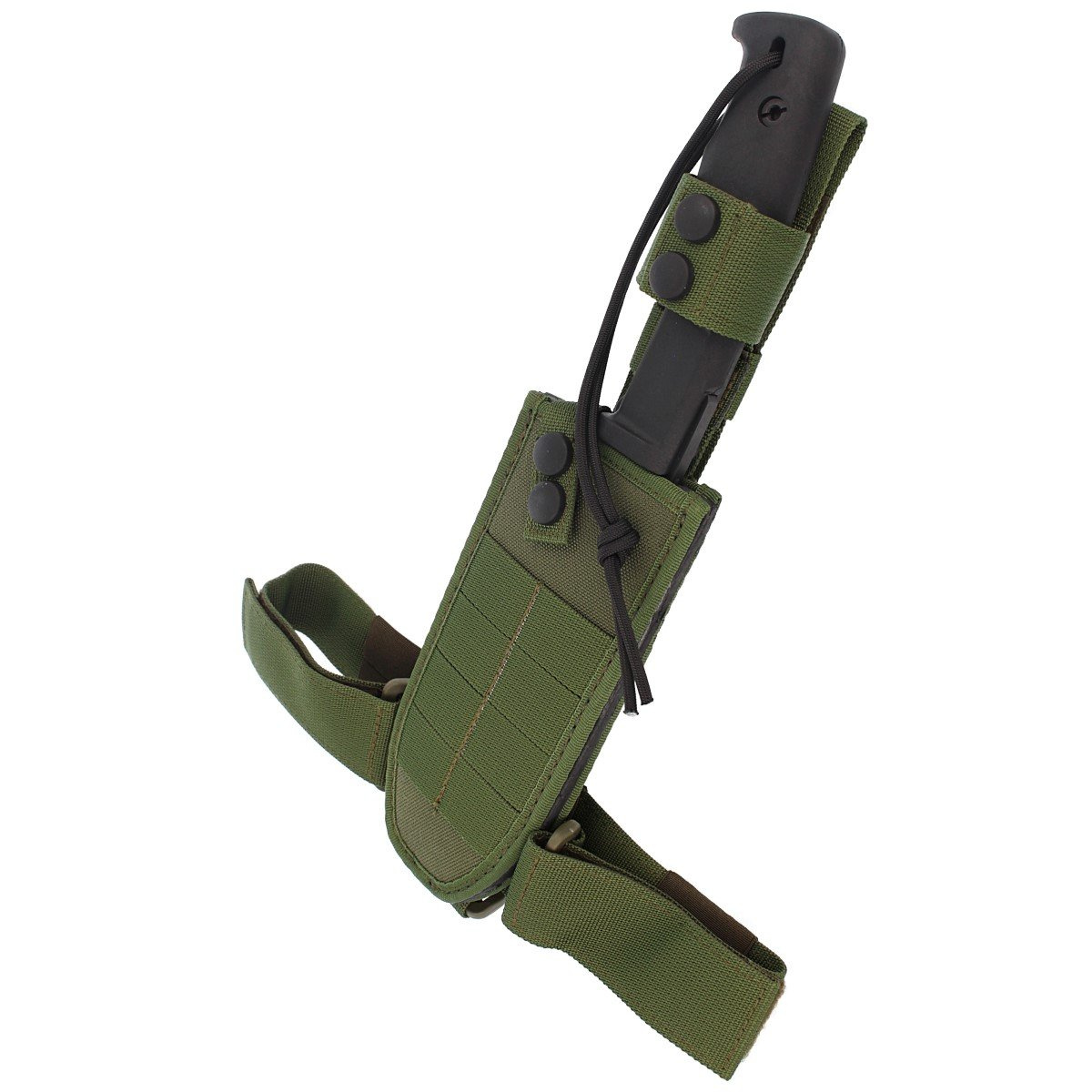 Pochwa - udowa z odpornego na przetarcia, wodoodpornego nylonu w kolorze zielonym z możliwością mocowanie pod taśmy systemu M.O.L.L.E. (Modular Lightweight Load-carrying Equipment). Kabura umożliwia przenoszenie noża na pasie lub na kamizelce zgodnej z systemem MOLLE. Dolna część pochwy z zapinaną na rzep Velcro taśmą, umożliwiającą mocowanie do uda.
