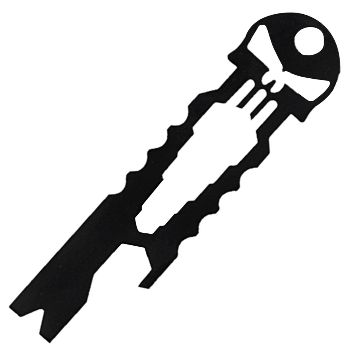 - Black Skull Tool Card, o kształcie czaszki marki Barbaric to niewielkich rozmiarów wielofunkcyjne narzędzie łączące szereg przydatnych funkcji. Dzięki niewielkim rozmiarom może być przenoszone w portfelu, nerce czy jako brelok z pękiem kluczy.