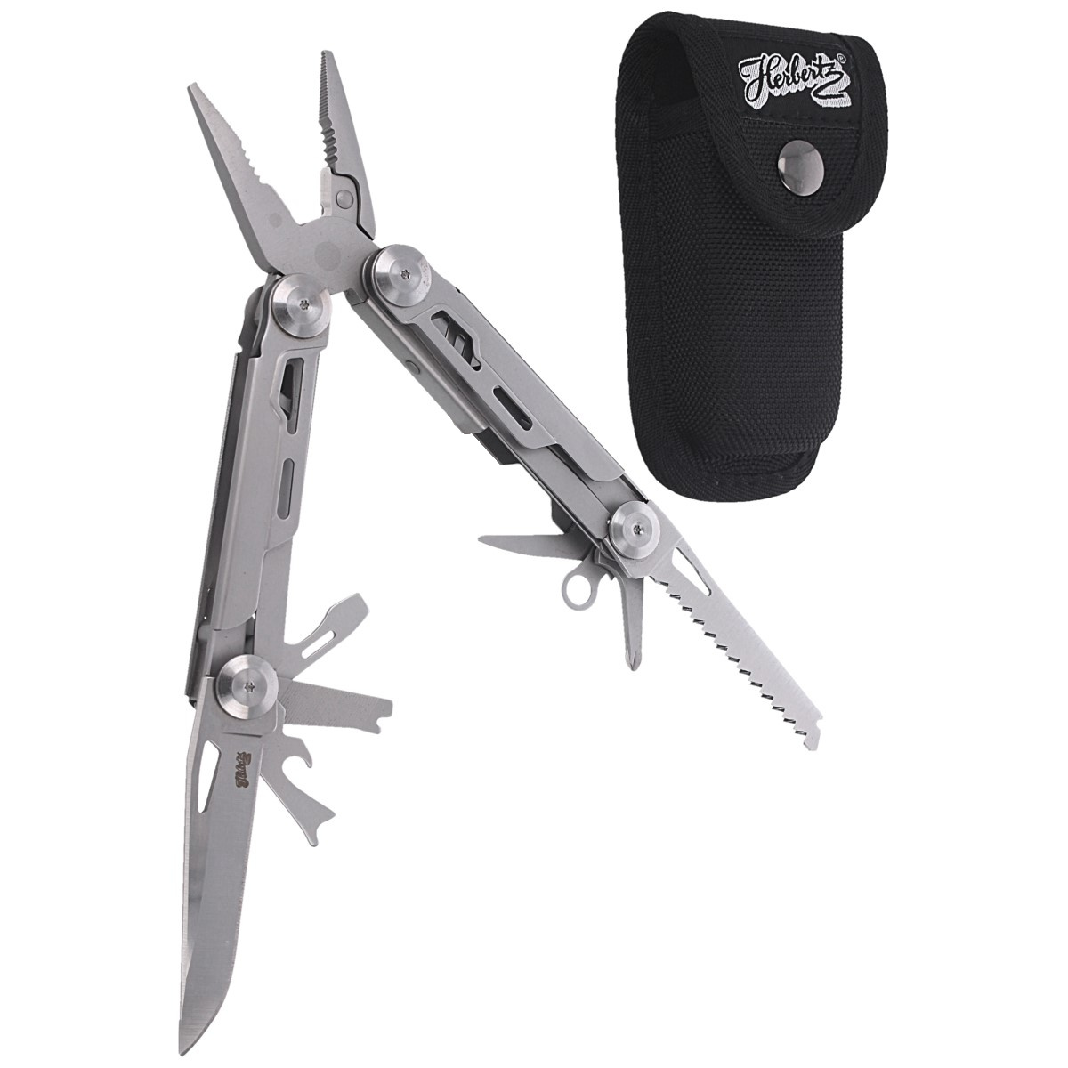 Multitool niemieckiej marki Herbertz Solingen, uchwyty wykonane ze satynowanej stali nierdzewnej. Wyposażony m.in. w kombinerki z przecinakiem do drutu, ostrze nożowe, piłę do drewna, otwieracz do butelek ze śrubokrętem płaskim, pilnik, otwieracz do puszek ze ściągaczem izolacji, szydło, oczko i śrubokręt krzyżakowy.