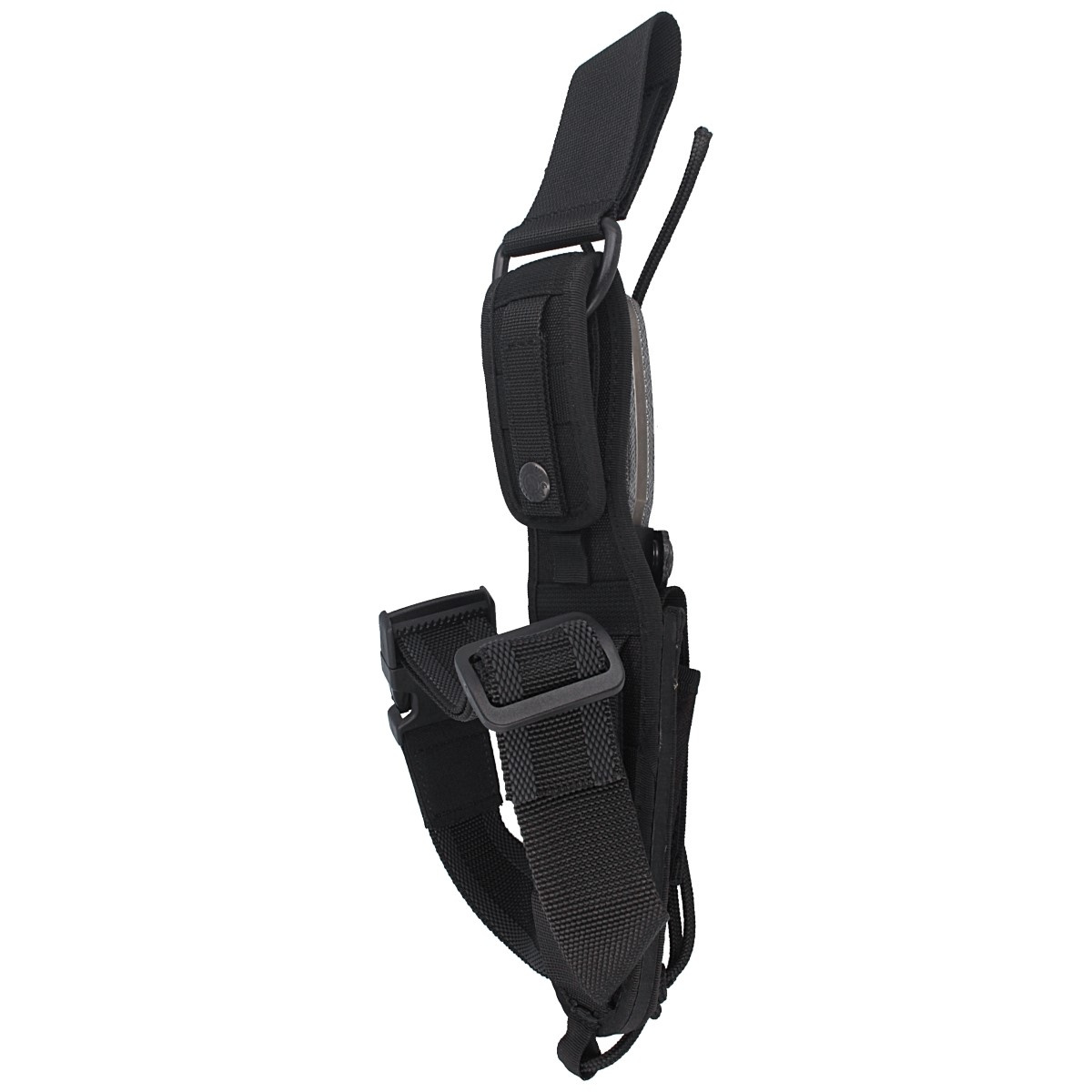 Pochwa - firmy Vega Holster z dodatkową kieszenią na akcesoria: ostrzarkę lub krzesiwo. Wykonana z wodoodpornej Cordury® w kolorze czarnym. Zapinana na zatrzaski kabura dobrze zabezpiecza nóż przed wypadnięciem. Umożliwia mocowanie pod taśmy systemu M.O.L.L.E. (Modular Lightweight Load-carrying Equipment), lub na pas. Dolna część pochwy z zapinaną na klamrę typu DuraFlex opaską udową z gumowym wzmocnieniem zapobiega przemieszczaniu się pochwy na udzie.