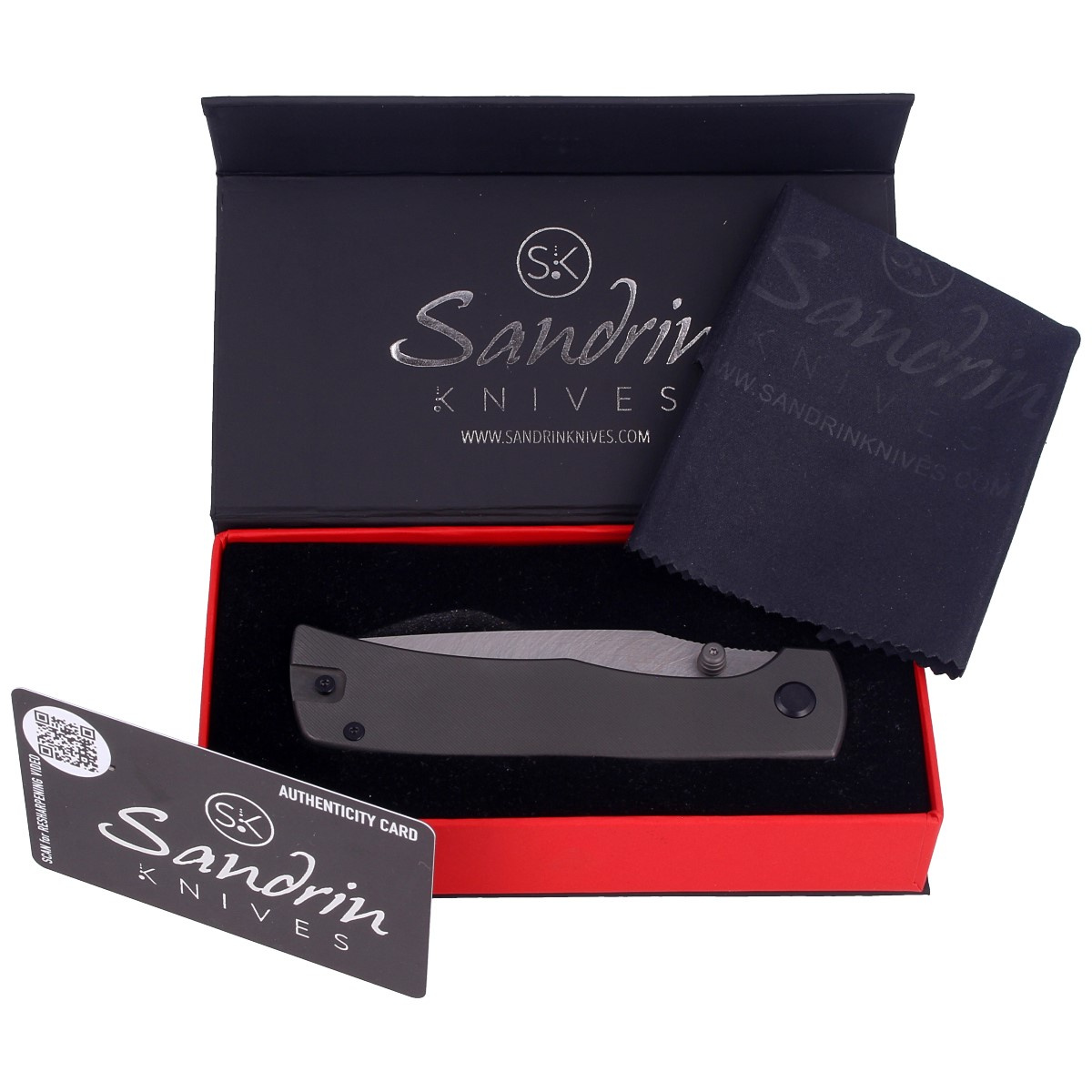 Rękojeść - okładziny z cyrkonu, metalu o dużo większej gęstości niż tytan i znacznie rzadziej występującego w przyrodzie. Lekko szorstka powierzchnia okładek zapewnia pewniejszy uchwyt, dodatkowo powierzchnia została pokryta dwutlenkiem cyrkonu, powłoką niezwykle odporną na uszkodzenia. Dwupozycyjny, lewo / prawostronny klips z tytanu pokryty powłoką PVD pozwala przenosić nóż w pozycji tip-up (czubkiem ostrza do góry). Klips wyposażono w serią matematycznie zaprojektowanych 5 okręgów wyciętych w celu odzwierciedlenia ciągu Fibonacciego - znaku rozpoznawczego marki Sandrin Knives.