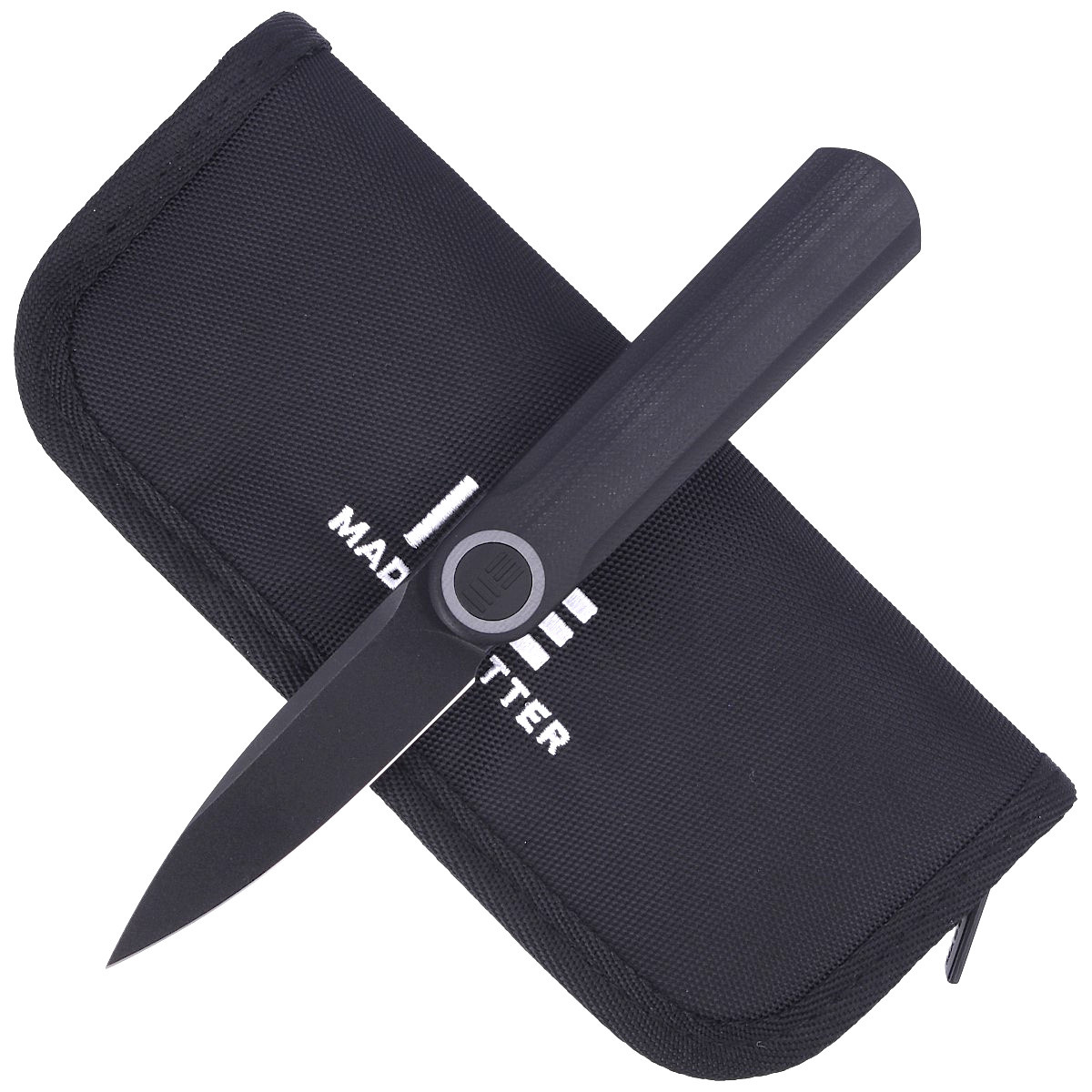 Rękojeść - monolityczna, wykonana z jednego kawałka czarnego G10, frezowanego obrabiarkami CNC 3D. Zapewnia to niewiarygodną wytrzymałość, wymaga jednak najwyższych umiejętności i precyzji w produkcji. Oś pivota zdobi stylizowane logo marki WE. Prawostronny, jednopozycyjny tytanowy klips deep carry pozwala przenosić dyskretnie w kieszeni nóż w pozycji tip-up (ostrzem do góry).