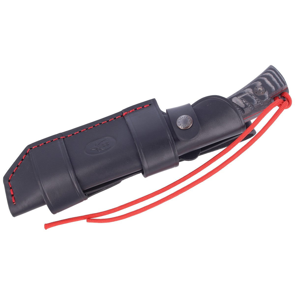 Pochwa - ręcznie szyta, wykonana z naturalnej skóry w kolorze brązowym z tłoczonym logo producenta. Mocowanie do pasa lub oporządzenia umożliwia przenoszenie noża w pozycji pionowej lub poziomej.