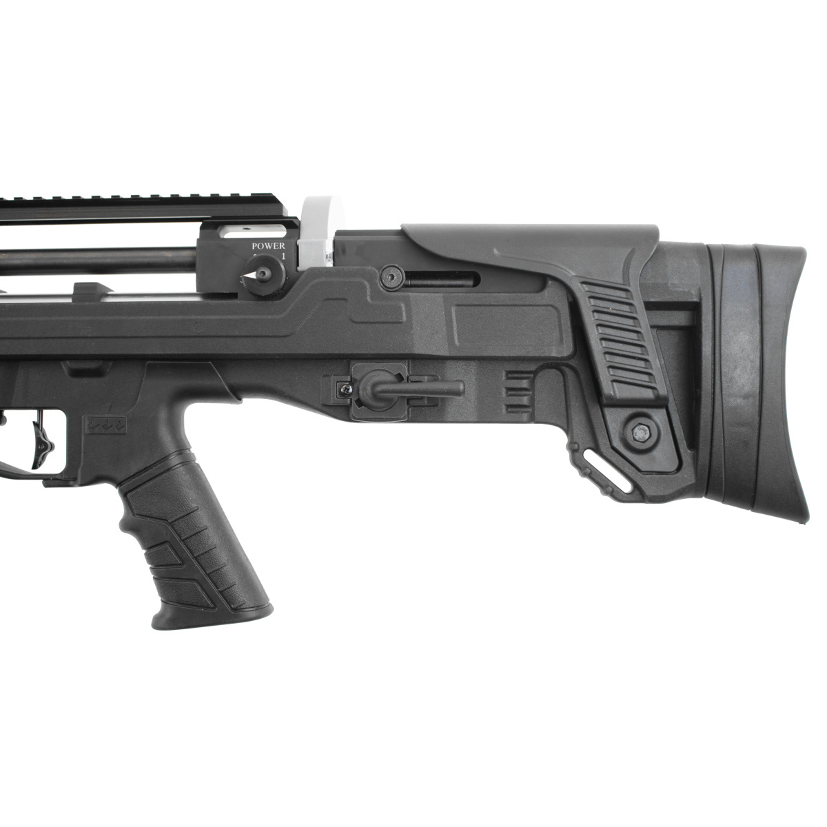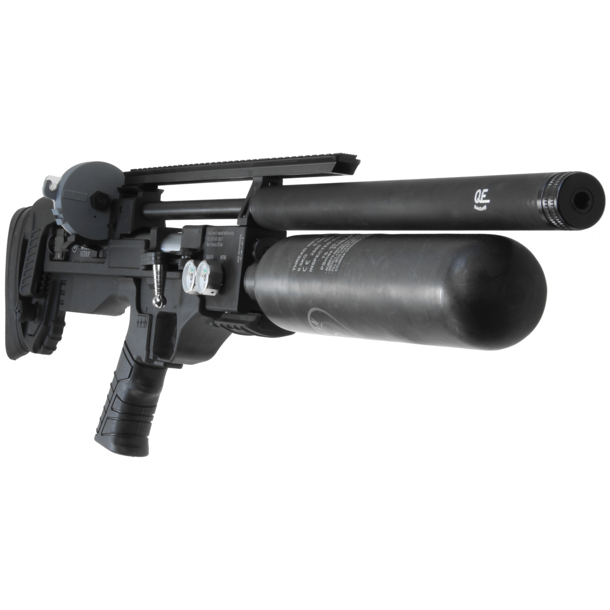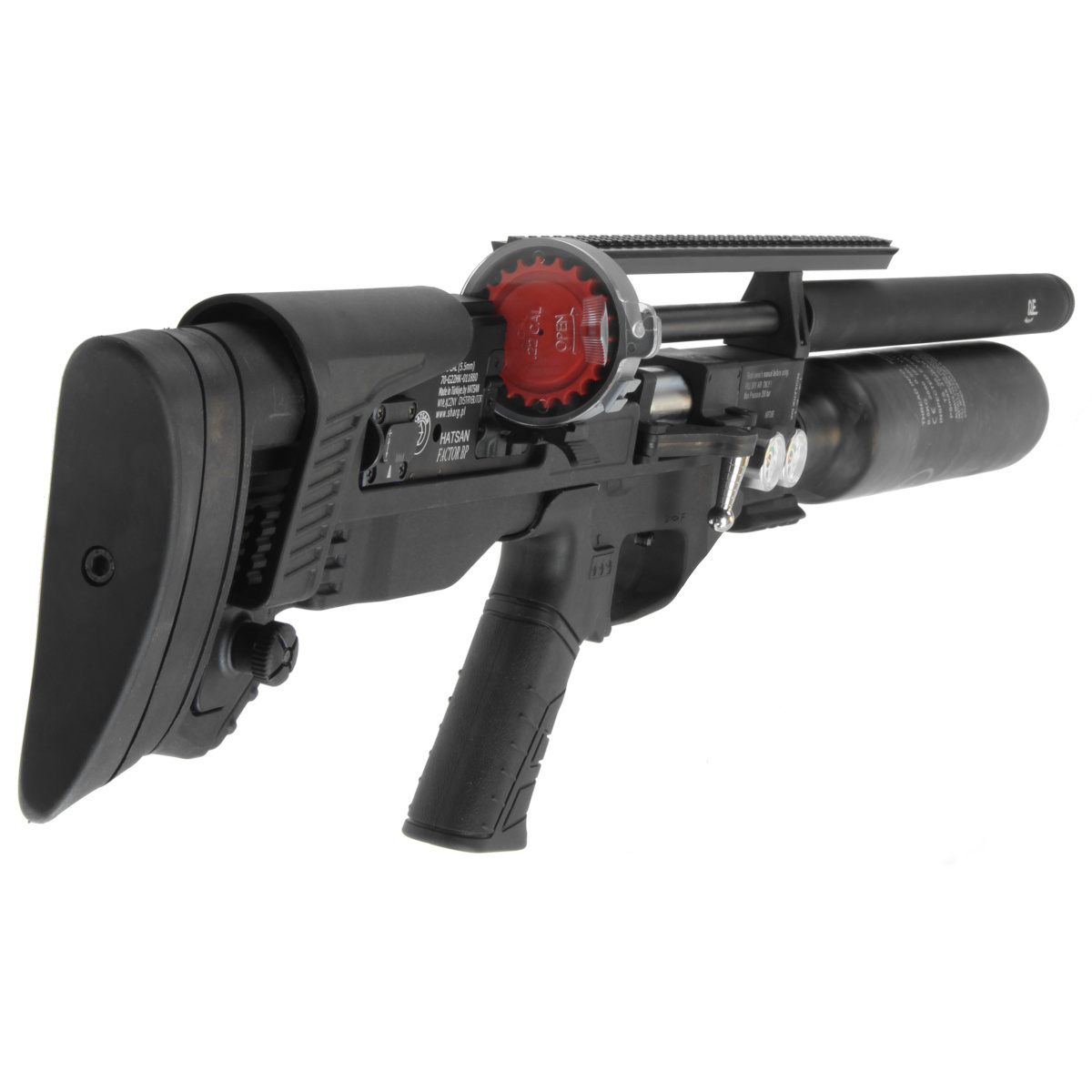 - FACTOR BP karabin PCP w znanej z przesunięcia komory i magazynika za spust wersji bullpup, kartuszem z włókna węglowego, dźwignią przeładowania Side Lever, regulatorem mocy strzału, pokrętłem regulacji mechanizmu spustowego, lufą ze zintegrowanym tłumikie