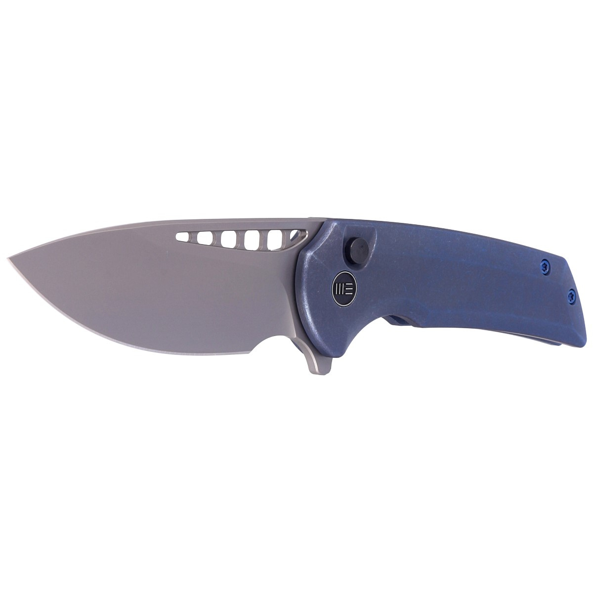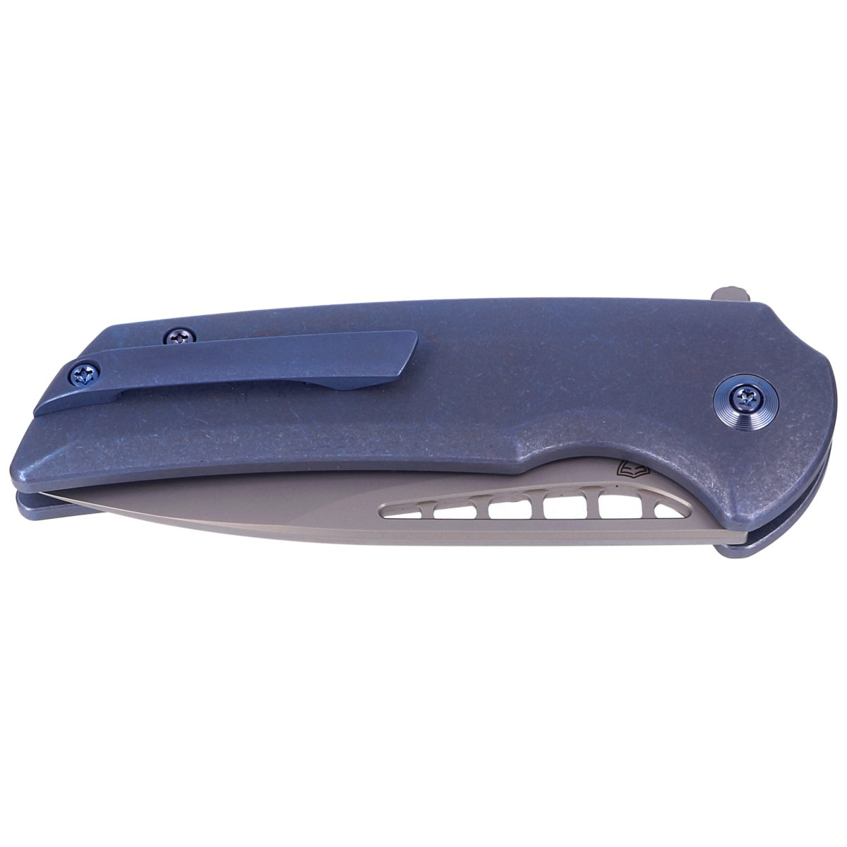- Mini Malice Blue Titanium, Silver Bead Blasted folder z szerokim ostrzem przystosowanym do intensywnego użytkowania. Owoc współpracy WeKnife z Ferrum Forge Knife Works. Podobnie jak wszystkie ich projekty ma doskonałą ergonomię, siłę cięcia i piękne linie