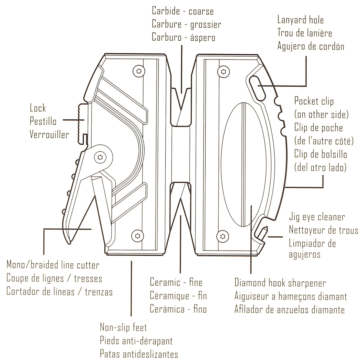 Narzędzie wyposażono w płytkę z napylonym posypem diamentowym, przeznaczony do ostrzenia haczyków wędkarskich. Niewielki kołek służy do przetykania przelotek w spławikach, a mini nożyczki sa przydatne przy cięciu żyłki lub linek.