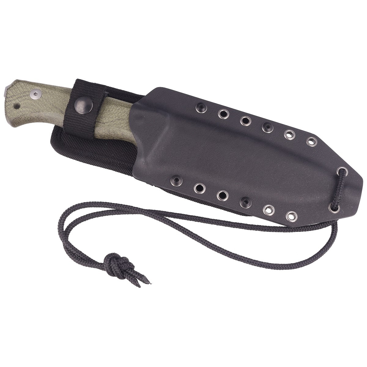 Pochwa - z tworzywa kydex łączonego z odporną na przetarcia, wodoodporną Cordurą w kolorze czarnym. Zabezpiecza przed wypadnięciem oraz ułatwia szybkie dobycie noża. Zapinana na zatrzask zabezpiecza nóż przed wypadnięciem. Kompatybilna ze standardem MOLLE umożliwia mocowanie kabury pod taśmy systemu M.O.L.L.E. (Modular Lightweight Load-carrying Equipment) lub przenoszenie na pasie lub na oporządzeniu.