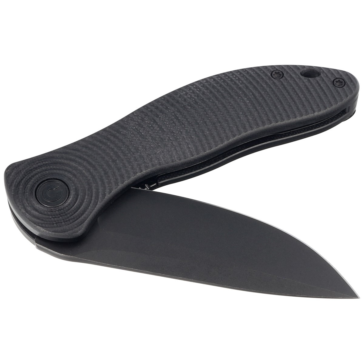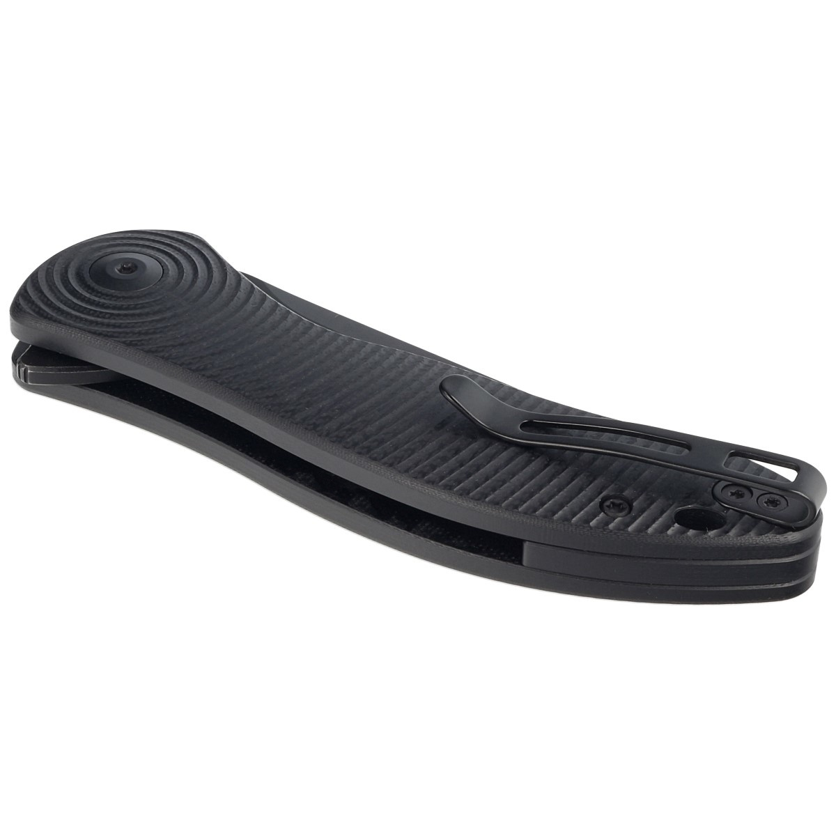 Rękojeść - okładziny z czarnego G10, włókna szklanego prasowanego pod ciśnieniem z żywicą, z pięknym wzorem koncentrycznie rozchodzących się okręgów. Fazowane krawędzie okładek eliminują ostre krawędzie dla wygody i poprawiają pewność uchwytu. Backspacer wykonano z tego samego materiału co okładziny rękojeści. Oś pivota zdobi stylizowane logo marki Civivi. Jednopozycyjny, prawostronny klips deep carry pozwala przenosić dyskretnie nóż w kieszeni w pozycji tip-up (czubkiem ostrza do góry).