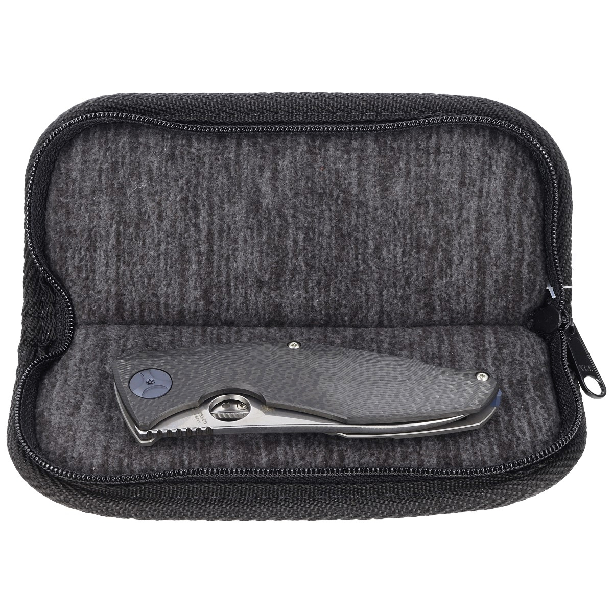 Rękojeść - po stronie prezentacyjnej Carbon Fiber o chaotycznym, "pijanym" (Drunken) wzorze. Po stronie blokady, solidny kawałek tytanu pokryty delikatnym wzorem pajęczej nici. Okładziny połączono ze sobą backspacerem, anodyzowanym na niebiesko. Tym samym kolorem anodyzowano śrubę pivota oraz klips. Solidny, jednostronny (prawa) tytanowy klips umożliwia noszenie noża w pozycji tip-up (czubkiem ostrza do góry). W górnej części backspacera lanyard hole, otwór na smycz lub linkę.