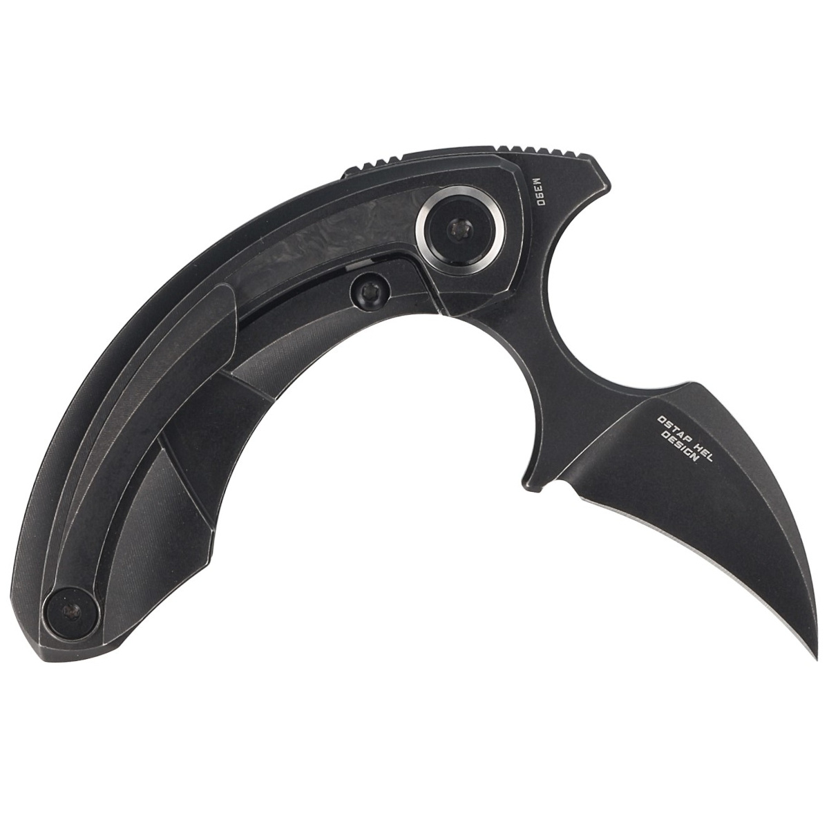 Głownia - typu Hawkbill z maskującym drobne rysy wykończeniem Black Stonewashed. Wklęsła krawędź tnąca zbiega się w kierunku ostrego jak igła czubka noża. Grubość klingi zapewnia wysoką wytrzymałość podczas gdy wysoki, płaski szlif daje doskonałą geometrię krawędzi tnącej oraz ekstremalną wydajność cięcia. Ceramiczne łożyska kulkowe wspomagają otwarcie ostrza za pomocą szybkiej płetwy flippera (index-finger flipper). Całość blokowana jest sprawdzoną i popularną blokadą frame lock ze stalową wkładką zabezpieczającą przed wycieraniem czoła blokady. Po otwarciu, przewężenie tuż za głownią pozwala wygodnie uchwycić nóż zaciśniętą ręką, w pozycji push-dagger. Ostrze wystaje wtedy spomiędzy palców niczym drapieżny szpon!