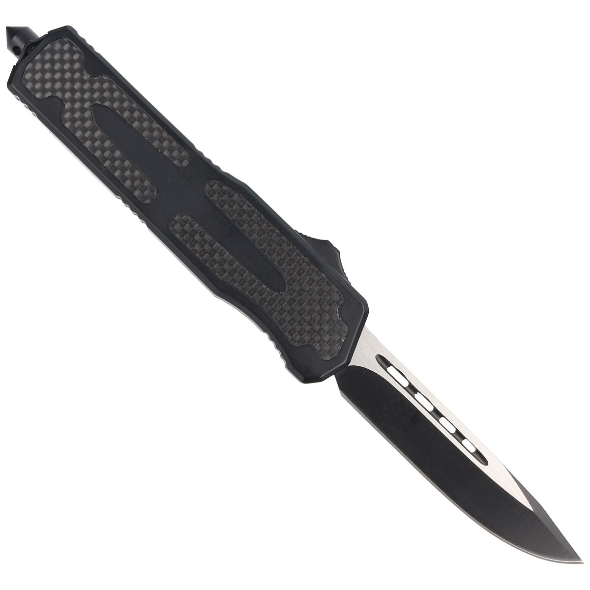 Dulotec Aluminium / Carbon Fiber, Two-Tone nóż automatyczny OTF (Out The Front) z głownią wysuwaną z przodu dzięki mocnej sprężynie. Pracuje w trybie D/A (Double Action) czyli za pomocą suwaka wysuwamy i chowamy ostrze. Projekt łączy czyste, nowoczesne linie z taktycznymi korzeniami. Mocna budowa, niezawodność działania oraz rozsądna cena to tylko nieliczne z zalet automatu. Bestseller!