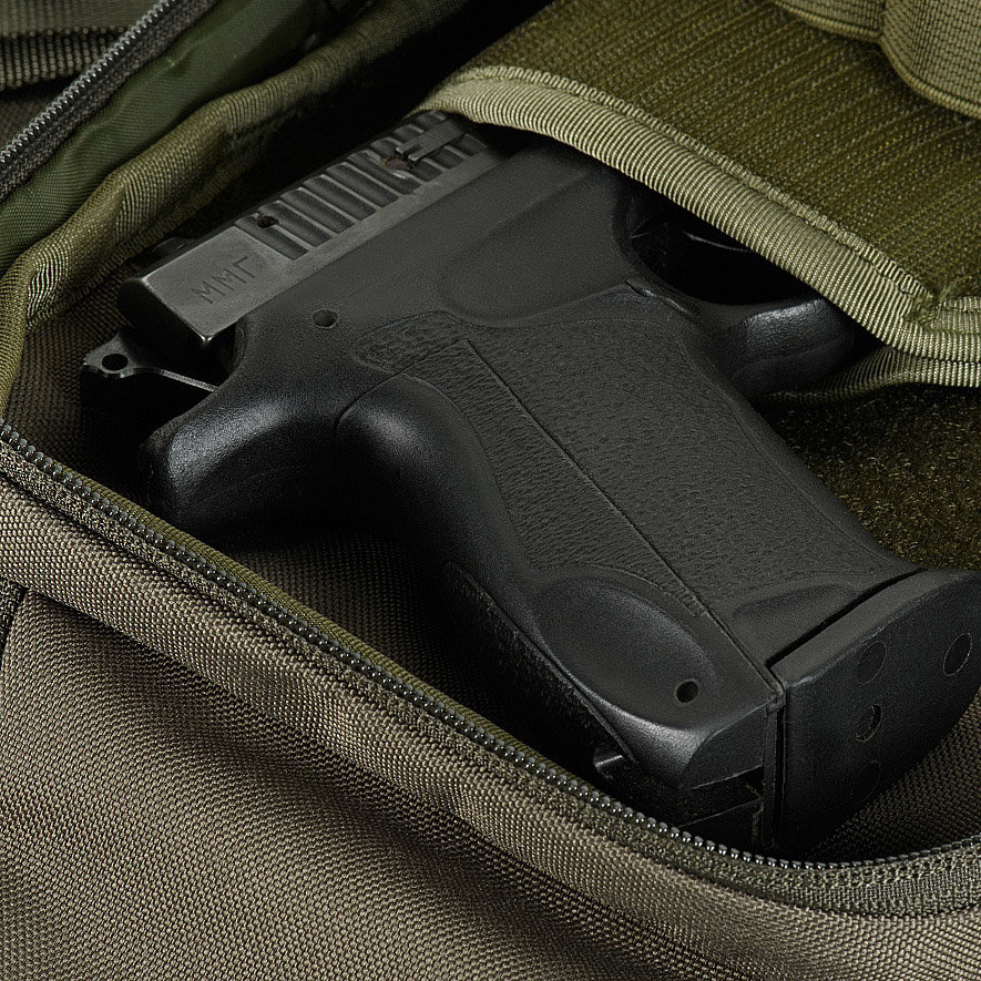 - Torba na ramie z kaburą przystosowana do skrytego przenoszenia broni krótkiej. Wewnątrz komory głównej umieszczono mocowaną na rzep uniwersalną kaburę, pasującą do większości pistoletów w tym Glock 17/19, Colt 1911, CZ-75, Walther P99.