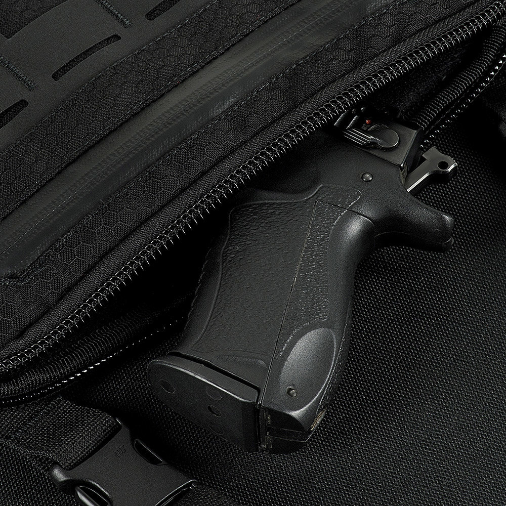 Kieszenie - dwie, umożliwiające spakowanie i pr donoszenie wielu, niezbędnych rzeczy. Z przodu znajduje się kieszeń wpuszczana, zamykana na wodoodporny zamek błyskawiczny i system molle do mocowania dodatkowego wyposażenia.