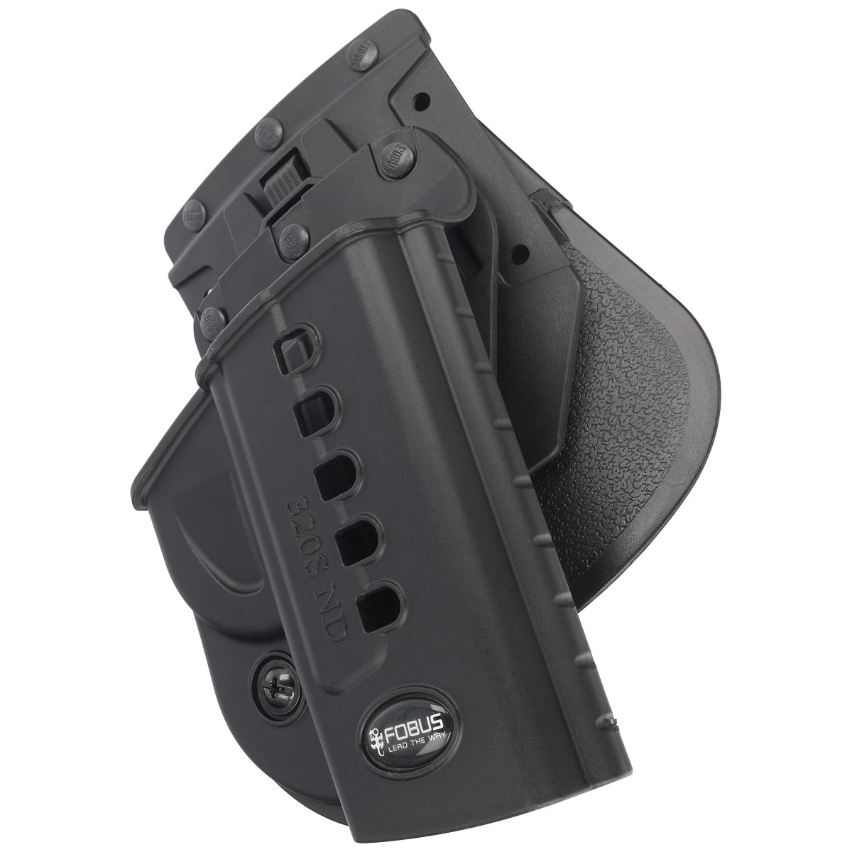 320S ND QL RP1 otwarta kabura zewnętrzna OWB (Outside the Waist Band) typu ND (New Design) izraelskiej firmy Fobus z uniwersalną platformą transportową single rail platform (RP1) wyposażoną w umożliwiający szybkie wypięcie kabury system QuickLock. Kabura zabezpiecza broń przed uszkodzeniem, nie ma tendencji do przemieszczania się. Wykonana metodą wtryskową z odpornego na zarysowania, udar oraz temperaturę nylonu, tworzywa sztucznego o dużej gęstości. Wersja dla praworęcznych.
