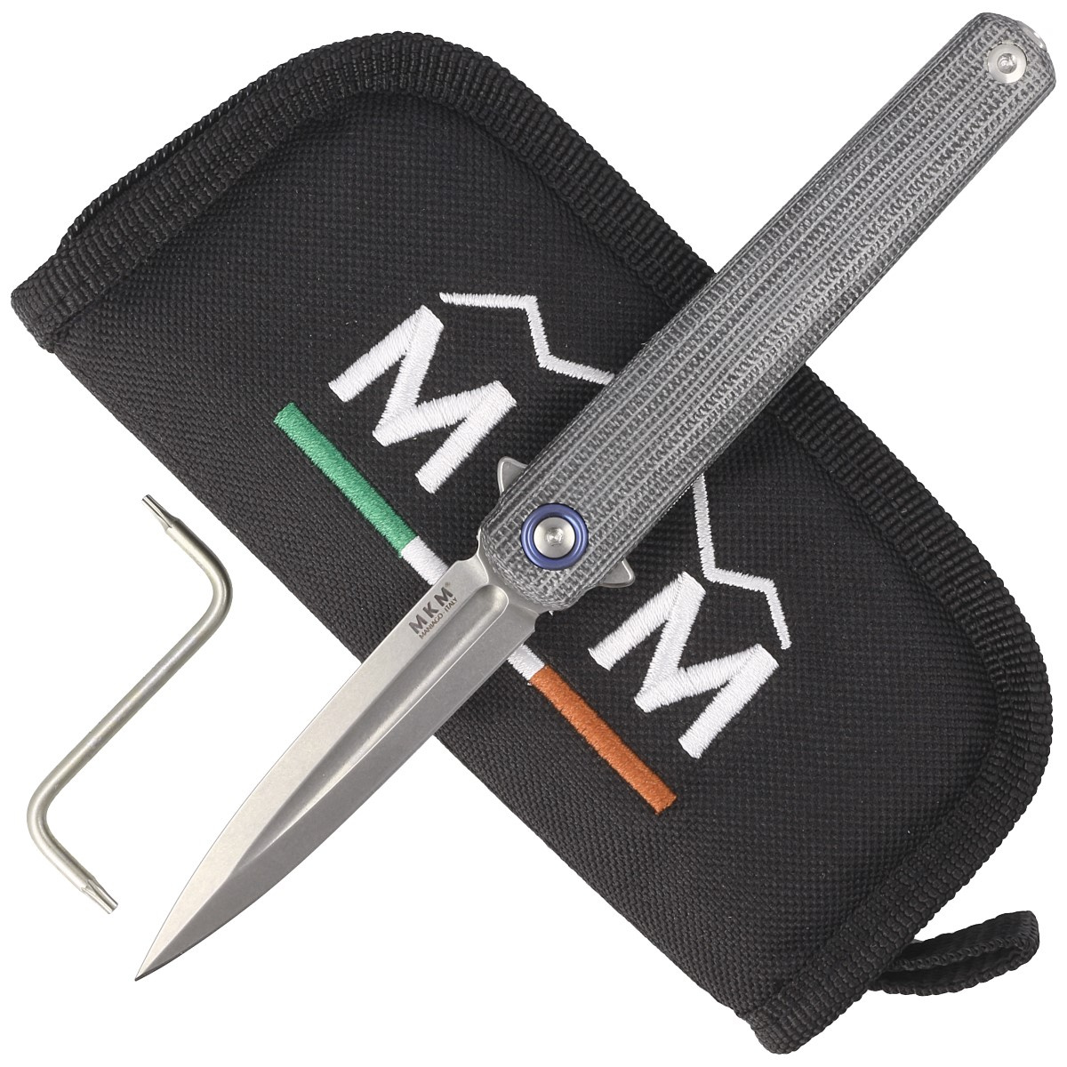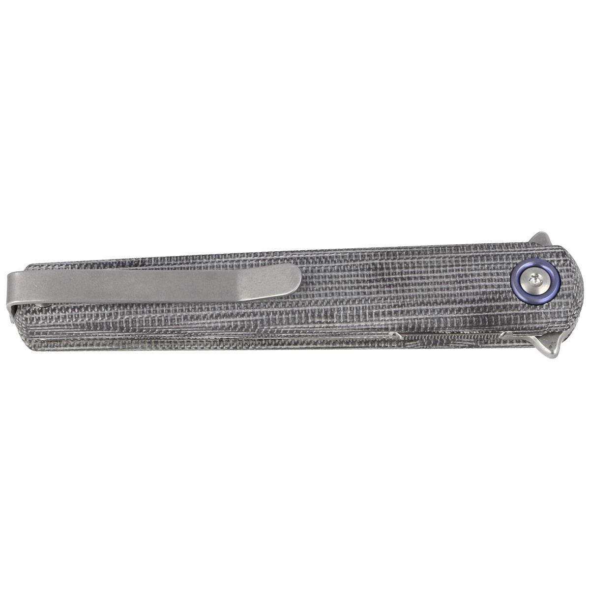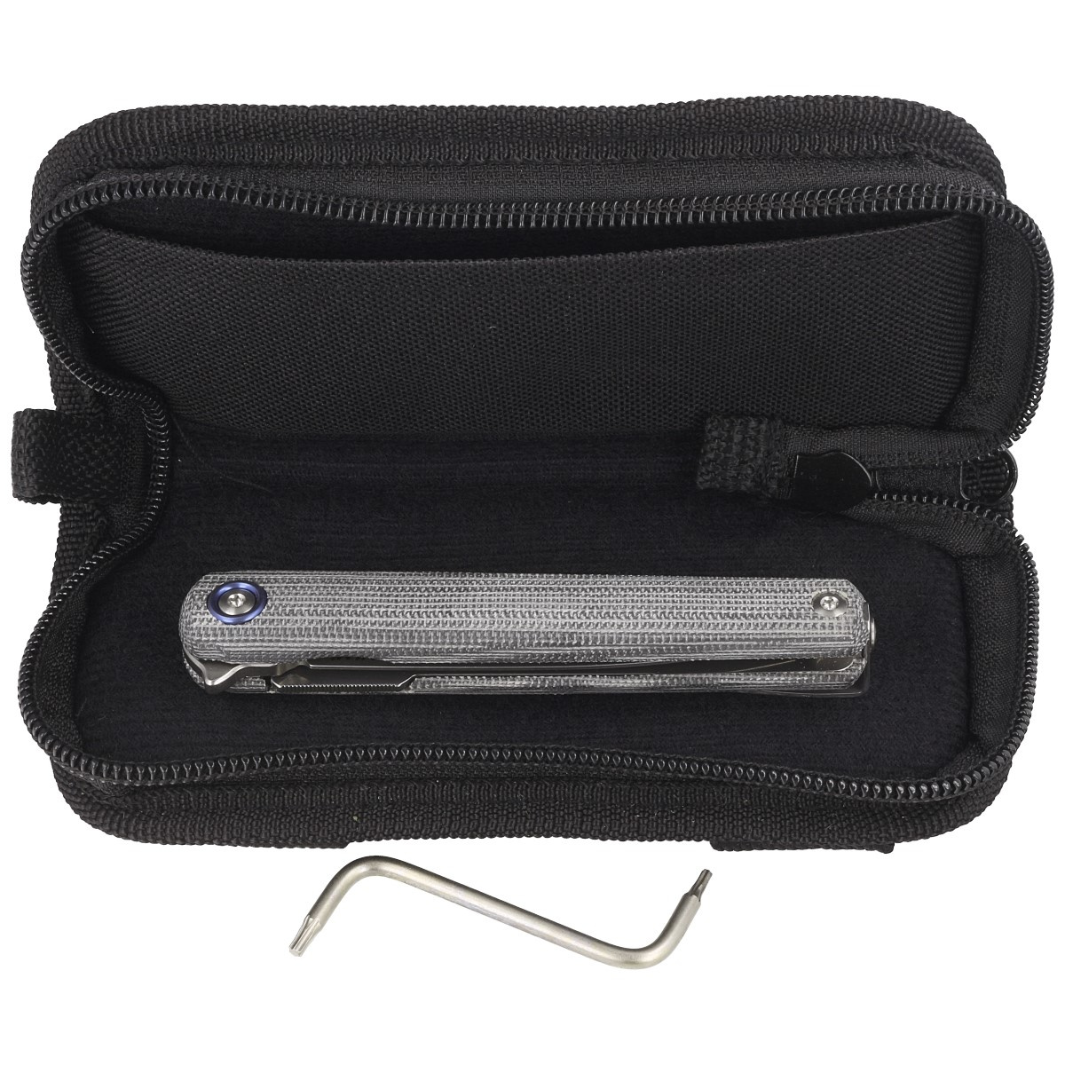 Rękojeść - z Canvas Micarty, materiału łączącego niską masę z wysoką odpornością na zużycie i warunki atmosferyczne. Lekko teksturowana powierzchnia zwiększa przyczepność, nawet w wilgotnym środowisku. Konstrukcja oparta na stalowych linersach skręconych przy pomocy dystansowej tulei zapewnia sztywność przy zachowaniu minimalnej wagi. Obustronny, głęboko osadzony deep carry clip umożliwia dyskretne przenoszenie foldera w kieszeni, zarówno przez użytkowników prawo-, jak i leworęcznych. Subtelny detal w postaci anodyzowanego pierścienia wokół pivota dodaje projektowi charakterystycznego akcentu. Folder dostarczany jest w miękkim etui z Cordury z zamkiem i opcją troczenia do paska – idealnym do bezpiecznego przenoszenia lub przechowywania. W zestawie znajdują się również klucze torx T6/T8.