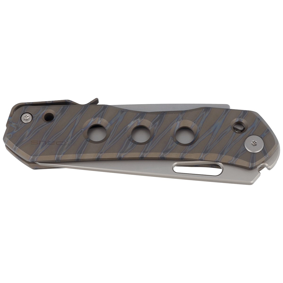 Rękojeść - to grube kawałki tytanu 6AL4V barwionego termicznie we wzór Tiger Stripes, połączone ze sobą tulejami dystansowymi. Prostota i solidność konstrukcji dają pewność wieloletniego użytkowania. Rękojeść została odciążona serią otworów w centrum okładzin. Klips dwupozycyjny (góra), wykonany z tytanu, umożliwia przenoszenie noża w pozycji tip-up. Zwraca uwagę jego nietypowe umieszczenie, na górze noża, a nie jak zwykle z boku. Rozwiązanie zaskakująco wygodne, pozwalające nosić nóż zarówno z lewej jak i prawej strony bez używania dodatkowych otworów i przekładania klipsa. W tylnej części znajduje się otwór do przewleczenia linki zabezpieczającej lub ozdobnej. Podobnie jak w innych modelach, oś pivota ozdobiona jest stylizowanym logiem producenta.