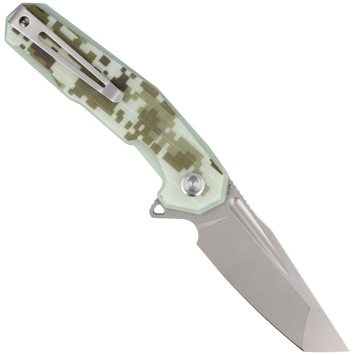 AUS-10 wytwarzana w hutach Takefu Special Steel Corporation z siedzibą w Fukui w Japonii, bogata w wanad 0.3% (V), molibden 1.20% (Mo) i kobalt 1.5% (Co) wysokowęglowa stal nierdzewna. Wyważone połączenie wysokiej zawartości węgla 1.05% (C) i chromu 15.50% (Cr) czyni stal nierdzewną o doskonałej odporności na korozję, wysokiej twardości (hartowanej w okolicach 60 HRC) i zdolności długiego trzymania krawędzi. W rezultacie nóż można łatwo naostrzyć, zapewniając ostre jak brzytwa ostrze.