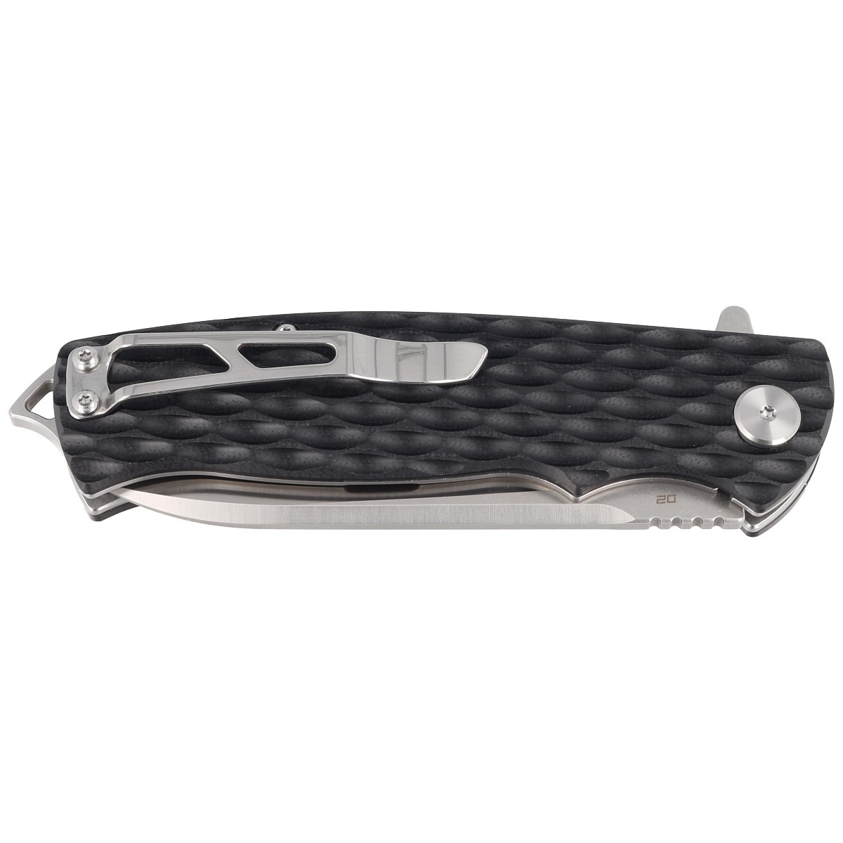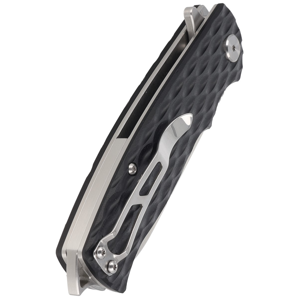 Rękojeść - okładziny z czarnego kompozytu G10, praktycznie niezniszczalnego tworzywa niewrażliwego na warunki atmosferyczne, odpornego na chemikalia i uszkodzenia mechaniczne Fazowane krawędzie okładek eliminują ostre ranty a charakterystyczne teksturowanie powierzchni poprawia pewność uchwytu. Masywny backspacer do którego przymocowano okładziny gwarantuje sztywność i wytrzymałość całej konstrukcji. Zakończenie backspacera wystaje poza obrys rękojeści tworząc kolec mogący służyć w awaryjnych sytuacjach jako zbijak do szyb lub narzędzie samoobrony. Jednopozycyjny, prawostronny klips umożliwia przenoszenie noża w pozycji tip-up, czubkiem ostrza ku górze.