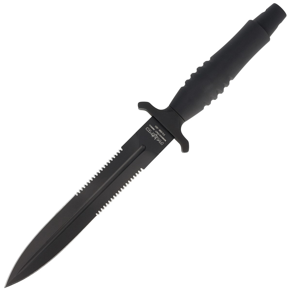 Głownia - niezwykle smukła o kształcie Dagger z obusiecznym symetrycznym ostrzem. Klingę pokryto czarną, nierefleksyjną powłoką Top Shield®. Klinga wyprowadzono szlifem płaskim (Flat grind) zapewniającym doskonałe właściwości tnące a zwłaszcza penetracyjne. Po obu stronach bliżej rękojeści piła o drobnych ząbkach. U nasady głowni double finger guard obustronny jelec chroniący dłoń przed zsunięciem się na ostrze.