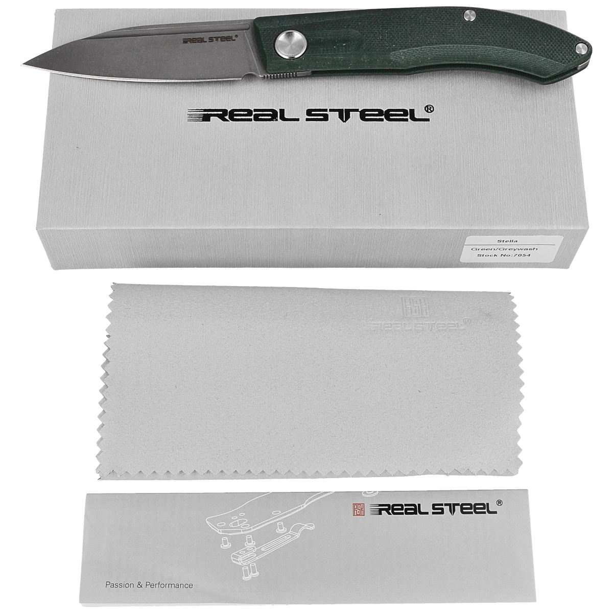 - Stella Green G10, Greywash jeszcze lżejsza wersja noża składanego z rodziny Stella, efekt współpracy polskiego projektanta Jakuba Wieczorkiewicza (Poltergeist Works) i firmy RealSteel Knives. Rękojeść z G10, stal nierdzewna VG-10. Lekki i kompaktowy!