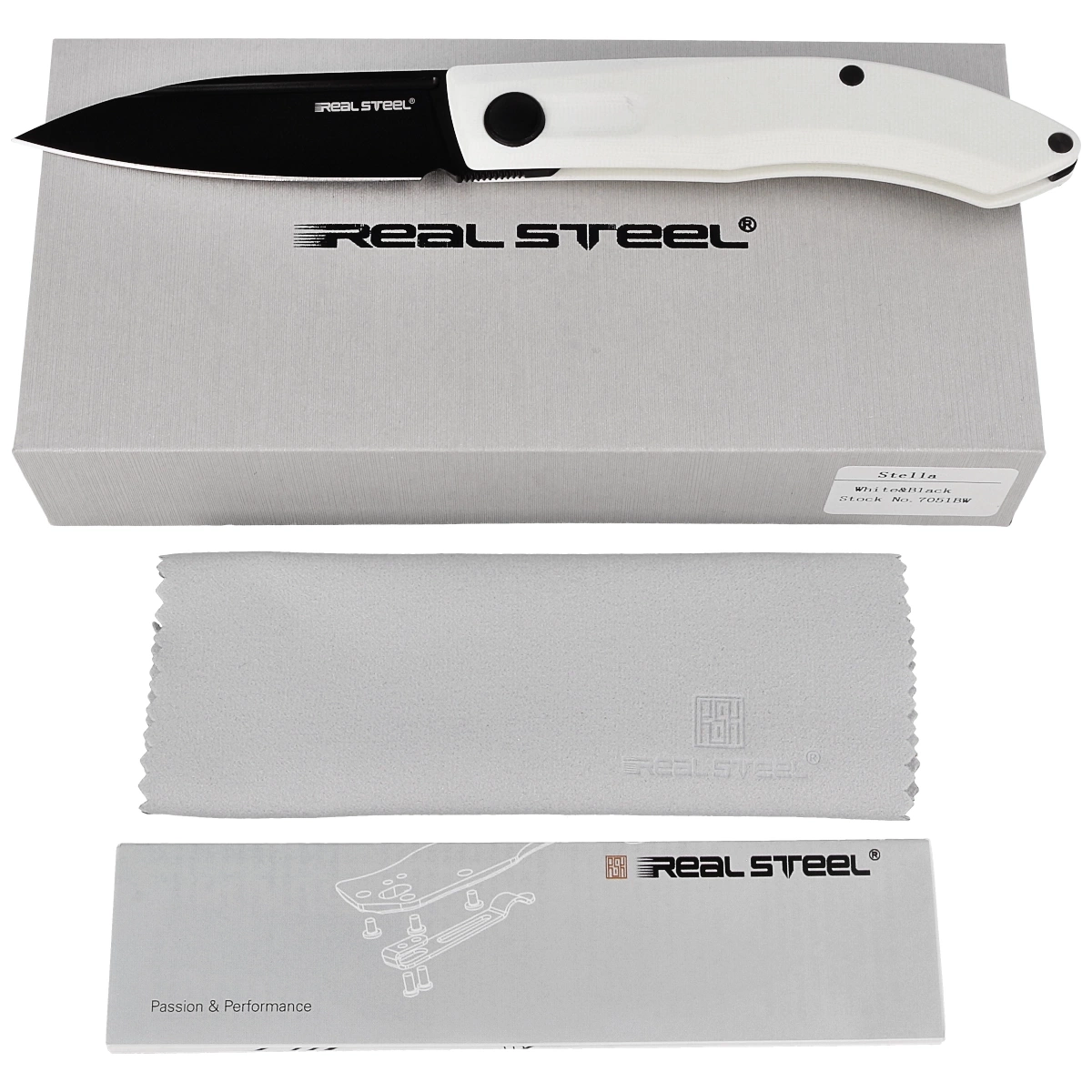 Stella White G10, Blackwash jeszcze lżejsza wersja noża składanego z rodziny Stella, efekt współpracy polskiego projektanta Jakuba Wieczorkiewicza (Poltergeist Works) i firmy RealSteel Knives. Rękojeść z G10, stal nierdzewna VG-10.  Lekki i kompaktowy, nowoczesny gentlemans folder!