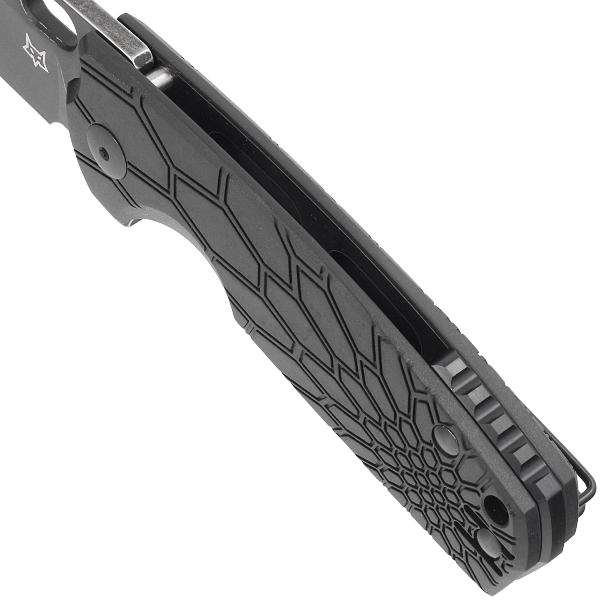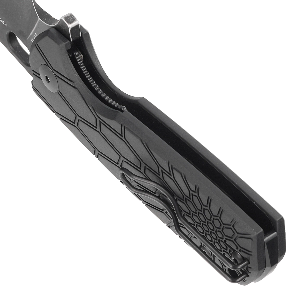 Rękojeść - okładziny z FRN (Fiberglass Reinforced Nylon), tworzywa lekkiego, niewrażliwego na warunki atmosferyczne, odpornego na chemikalia i uszkodzenia mechaniczne. Fazowane krawędzie okładek eliminują ostre ranty a teksturowanie powierzchni poprawia pewność uchwytu. Masywny backspacer do którego przymocowano okładziny gwarantuje sztywność i wytrzymałość całej konstrukcji. Dwupozycyjny (prawa/lewa) lekki klips z drutu (wire clip) umożliwia przenoszenie noża w pozycji tip-up, czubkiem ostrza ku górze. Nad klipsem otwór do przewleczenia linki zabezpieczającej lub ozdobnej.