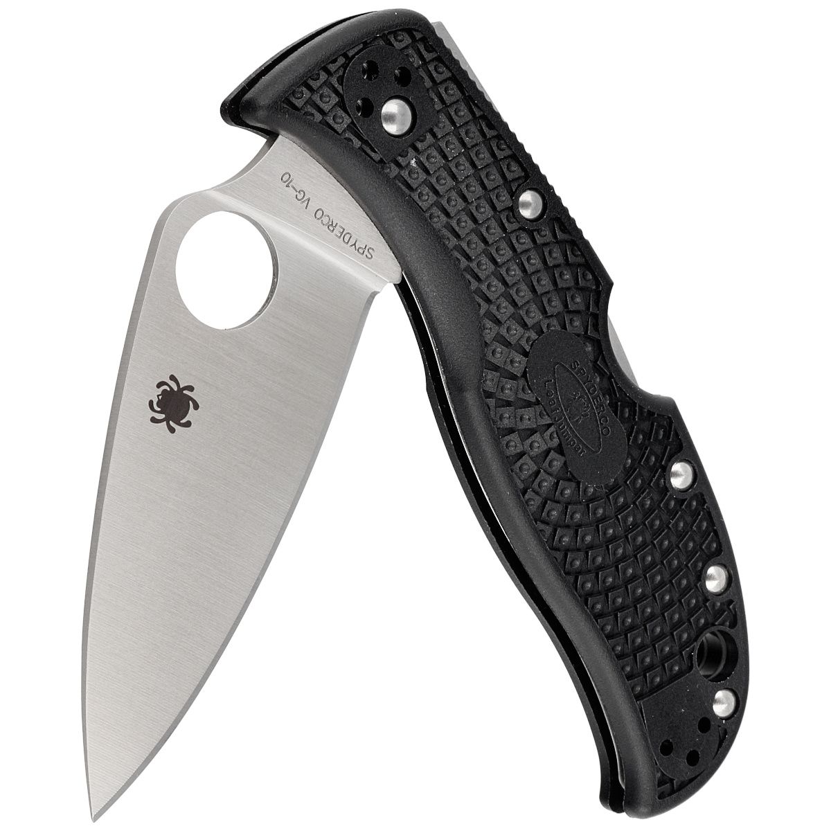 Głownia - o profilu Leaf (liść) z ekstremalnie ostrym czubkiem. Zakrzywiona krawędź tnąca na całej długości zapewnia wyjątkową wydajność cięcia z pełną siłą, przenosząc moc na sztych ostrza, gwarantuje lepszą wytrzymałość punktową. Wykonana z hartowanej w przedziale 59-61 HRC japońskiej stali nierdzewnej VG-10. Ostrze gładkie Plain wyprowadzono szlifem płaskim pełnym (Full Flat Grind). Powiększone 14 mm okrągłe wycięcie SpyderHole umożliwia otwarcie klingi również w rękawicy. Rampa na grzbiecie głowni ustawia kciuk, dając solidne podparcie oraz ułatwia operowanie folderem. Solidna blokada głowni Back-Lock.