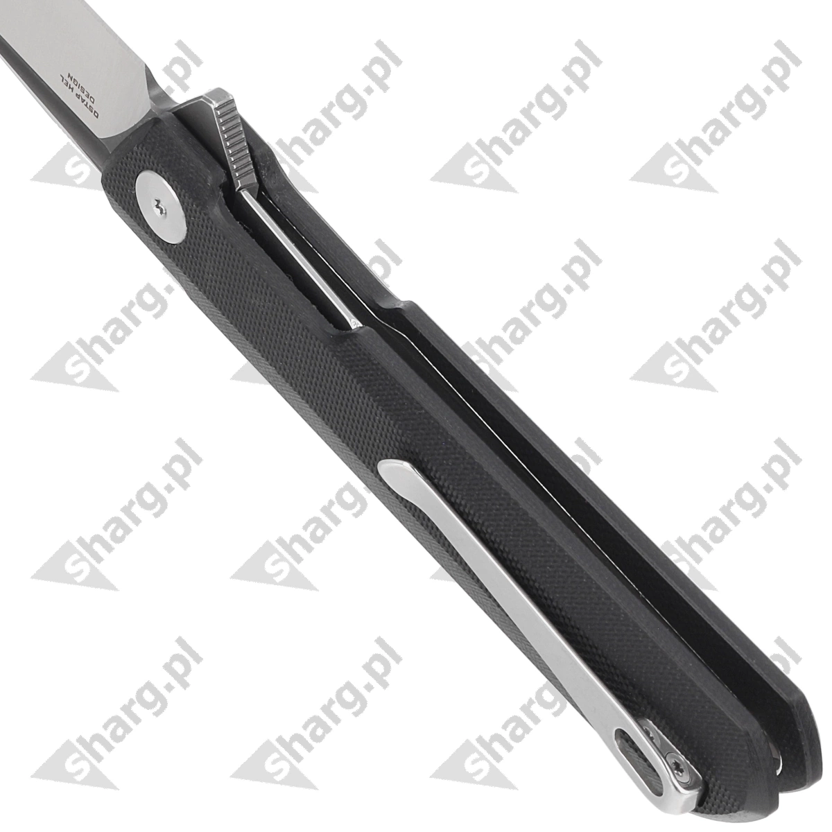 Głownia - typu Clip Point o długiej krawędzi tnącej, wykończona elegancką metodą Satin. Zagłębienie zbrocza dla kontrastu pokryto szarą powłoką na bazie tytanu. Niewielka grubość klingi w połączeniu z wysokim, płaskim szlifem daje doskonałą geometrię krawędzi tnącej oraz ekstremalną wydajność cięcia. Ceramiczne łożyska kulkowe wspomagają płynną pracę mechanizmu otwierającego klingę, którą można otworzyć za pomocą szybkiej płetwy flippera (index-finger flipper). Po otwarciu płetwa tworzy mini-gardę zapobiegającą ześlizgnięciu się dłoni na ostrze. Na grzbiecie klingi upper jimping, karbowane oparcie pod kciuk. Całość blokowana jest solidną blokadą Liner Lock.