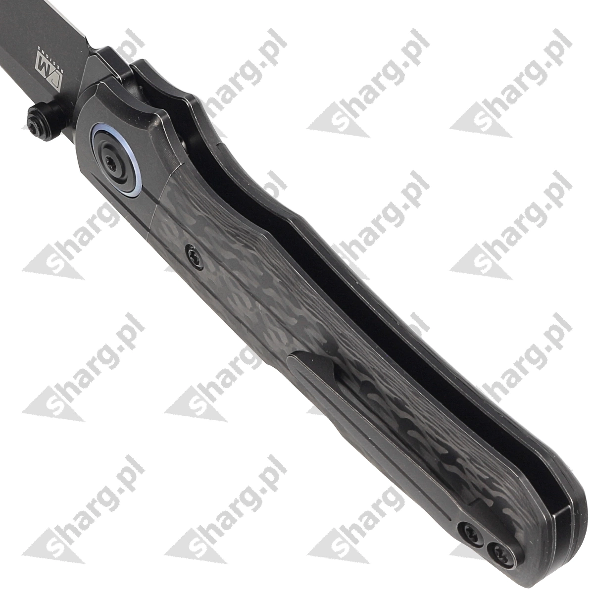 Rękojeść - okładziny z Carbon Fiber, praktycznie niezniszczalnego tworzywa niewrażliwego na warunki atmosferyczne, odpornego na chemikalia i uszkodzenia mechaniczne i tytanowymi bolsterami. Tytanowy backspacer do którego przymocowano okładziny, gwarantuje sztywność i wytrzymałość całej konstrukcji. Dwupozycyjny (prawa/lewa) klips umożliwia przenoszenie noża w pozycji tip-up, czubkiem ostrza ku górze.