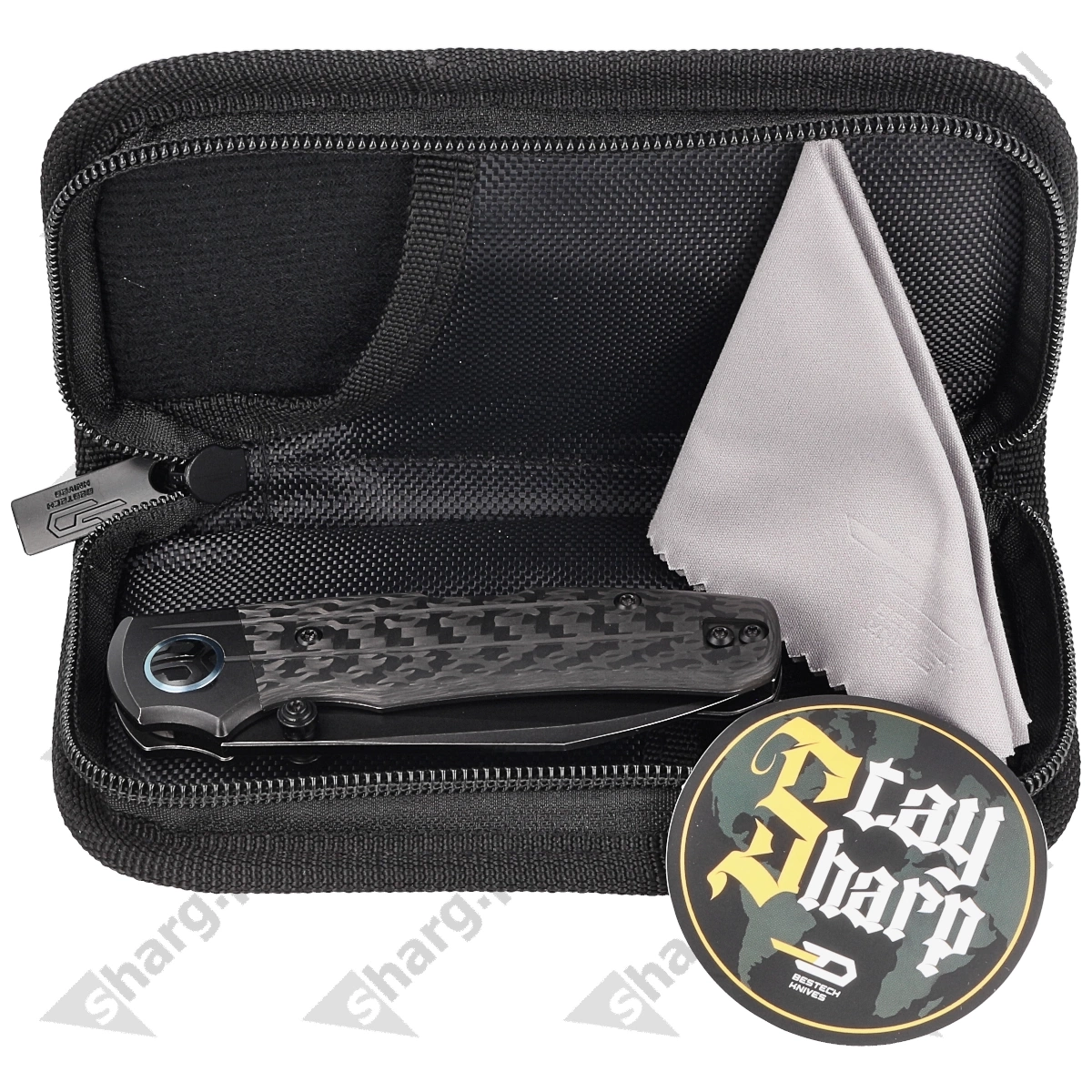 Futerał - nóż zapakowano w zapinany zamkiem nylonowy miękki pouch z logo marki służący do bezpiecznego przenoszenia i przechowywania foldera.