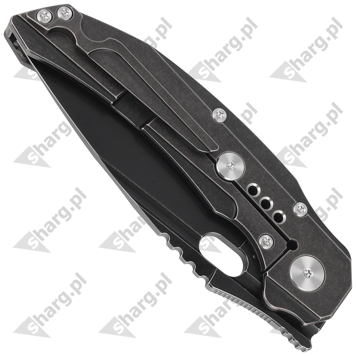 Głownia - szeroka, typu Spear Point z maskującym rysy wykończeniem metodą Stonewashed które zostało pokryte czarną powłoką. Wydatny brzusiec wydłuża długość krawędzi tnącej w stosunku do długości klingi zbiegając się w kierunku ostrego jak igła czubka noża. Grubość klingi zapewnia wysoką wytrzymałość podczas gdy wysoki, płaski szlif daje doskonałą geometrię krawędzi tnącej oraz ekstremalną wydajność cięcia. Dodatkowym wzmocnieniem jest długie zbrocze. Ceramiczne łożyska kulkowe wspomagają otwarcie ostrza za pomocą szybkiej płetwy front flippera (index-finger front flipper). Nóź możemy również otworzyć przy użyciu otworu w klindze (thumb hole). Całość blokowana jest sprawdzoną i popularną blokadą frame lock ze stalową wkładką zabezpieczającą przed wycieraniem czoła blokady.